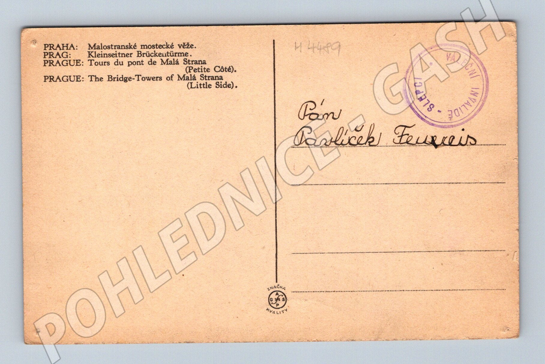 Originální historická pohlednice zobrazující Malostranské mostecké věže v Praze (Praha - Malostranské mostecké věže). Pohlednice je malého formátu a pochází z období před rokem 1950. Na zadní straně pohlednice se nachází text v několika jazycích popisující věže, ručně psaná adresa a razítko Váleční invalidé slepci . Pohlednice je vhodná pro sběratele historických pohlednic s tematikou Prahy a architektury. Stav odpovídá stáří, viz foto. Výjimečný sběratelský kus ilustrující pražskou historii a architekturu.