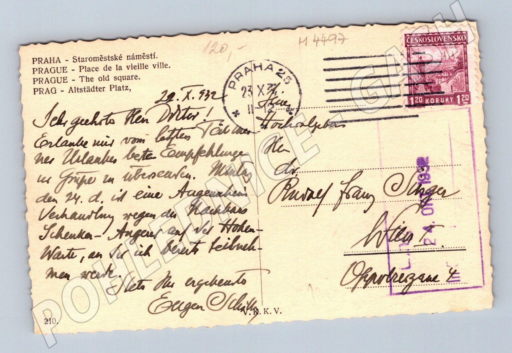 Originální pohlednice Staroměstského náměstí v Praze, vydaná před rokem 1950. Na přední straně je zachyceno slavné náměstí s Týnským chrámem, Staroměstskou radnicí a orlojem, obklopené historickými budovami, automobilovou dopravou a rušnou atmosférou centra města. Zadní strana pohlednice obsahuje osobní dopis v němčině, poštovní razítko z Prahy z roku 1932 a originální známku Československo v hodnotě 1,20 Kč. Skvělý sběratelský kousek pro milovníky historické Prahy, architektury a starých pohlednic. Pohlednice nese běžné stopy stáří odpovídající svému věku.