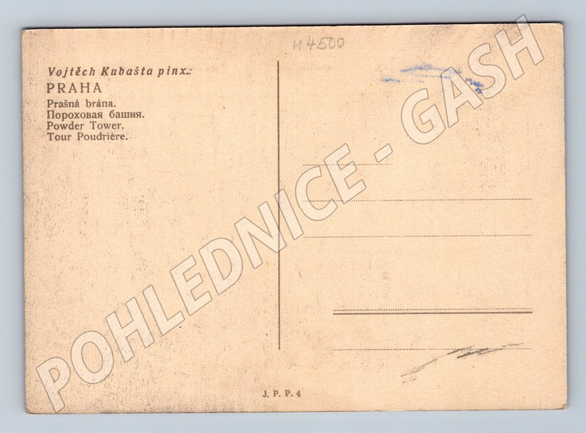Originální stará pohlednice Prahy s motivem Prašné brány. Podle popisu na zadní straně, autorem ilustrace je Vojtěch Kubašta. Pohlednice byla vydána vydavatelstvím J. P. P. 4., má menší rozměr typický pro období do roku 1950. Na obrázku je krásně zachycena historická atmosféra centra Prahy s dobovým automobilem a postavami chodců v popředí. Pohlednice je čistá, nepopsaná, velmi dobře zachovalá. Skvělý sběratelský kus pro milovníky staré Prahy a historických pohlednic.