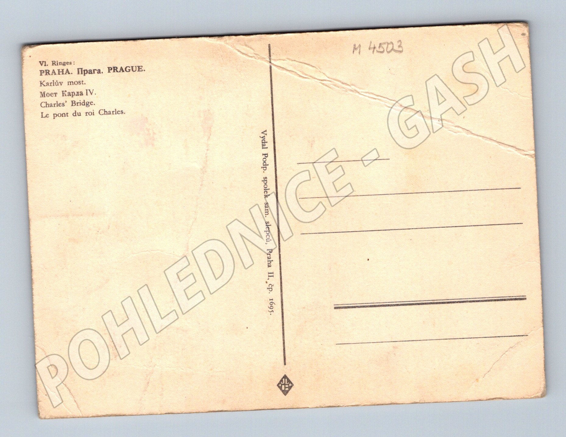 Nabízím starou pohlednici formátu do roku 1950 s motivem Prahy – Karlův most a okolní panorama. Na přední straně je krásná malovaná ilustrace zachycující slavný most přes Vltavu se Staroměstskou mosteckou věží a okolní zástavbou v romantickém stylu. Ve spodní části pohlednice je zachycen klidný břeh řeky s lodkami, rybáři a dětmi hrajícími si u vody. Zadní strana je nepopsaná. Pohlednice nese běžné známky stáří: mírné natržení a ohyby v rozích a uprostřed. Text na zadní straně v několika jazycích potvrzuje lokalitu: Praha, Karlův most. Ideální pro sběratele historických pohlednic Prahy.