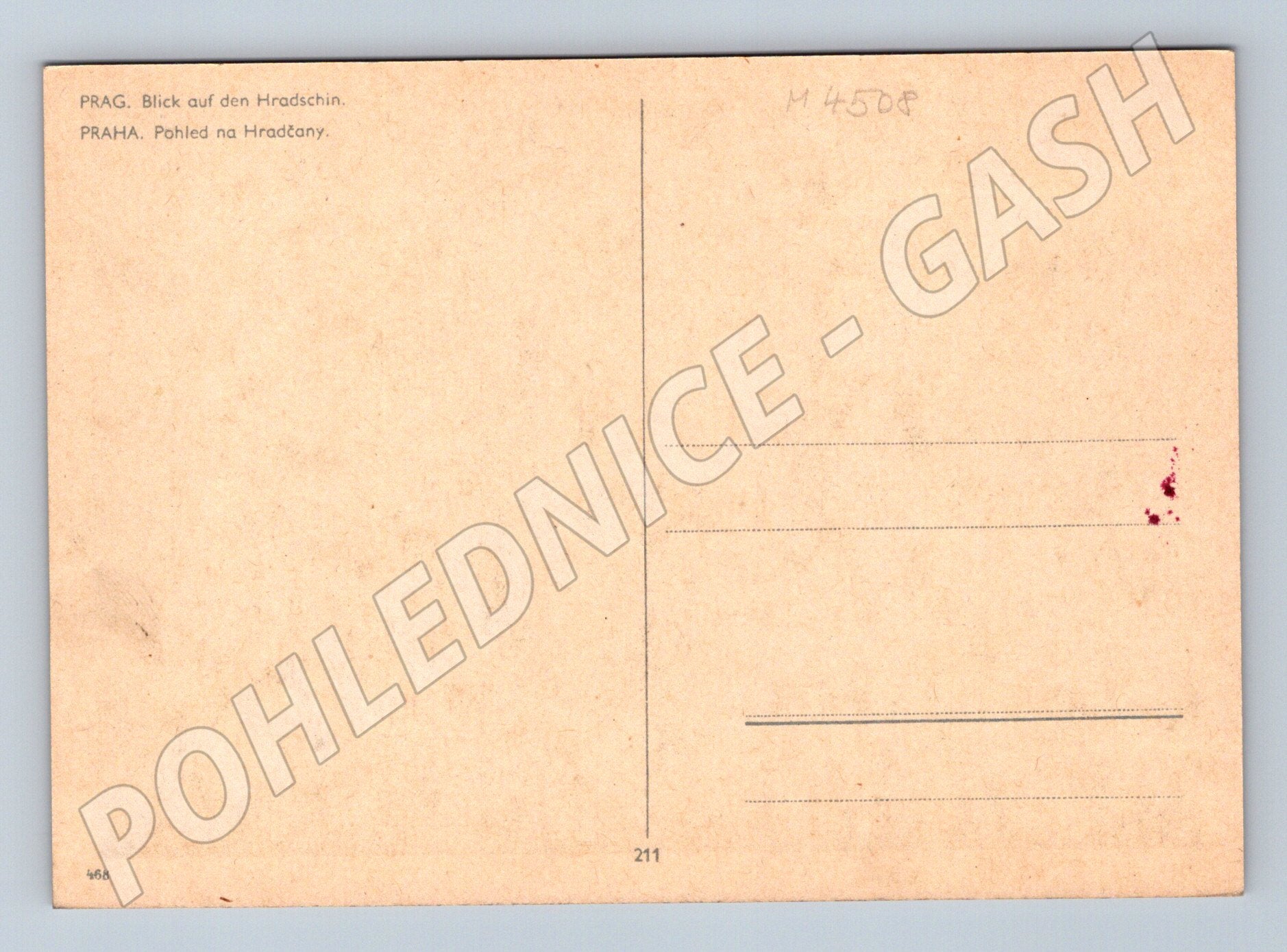 Starý černobílý pohled na Pražský hrad a Hradčany. Pohlednice nese popis v němčině i češtině: PRAG. Blick auf den Hradschin. PRAHA. Pohled na Hradčany. Jedná se o klasickou pohlednici malého formátu, pravděpodobně z první poloviny 20. století, vhodnou pro sběratele historických pohlednic a milovníky Prahy. Na zadní straně pohlednice nejsou žádné známky ani text, pohlednice je čistá, velmi pěkně zachovalá.