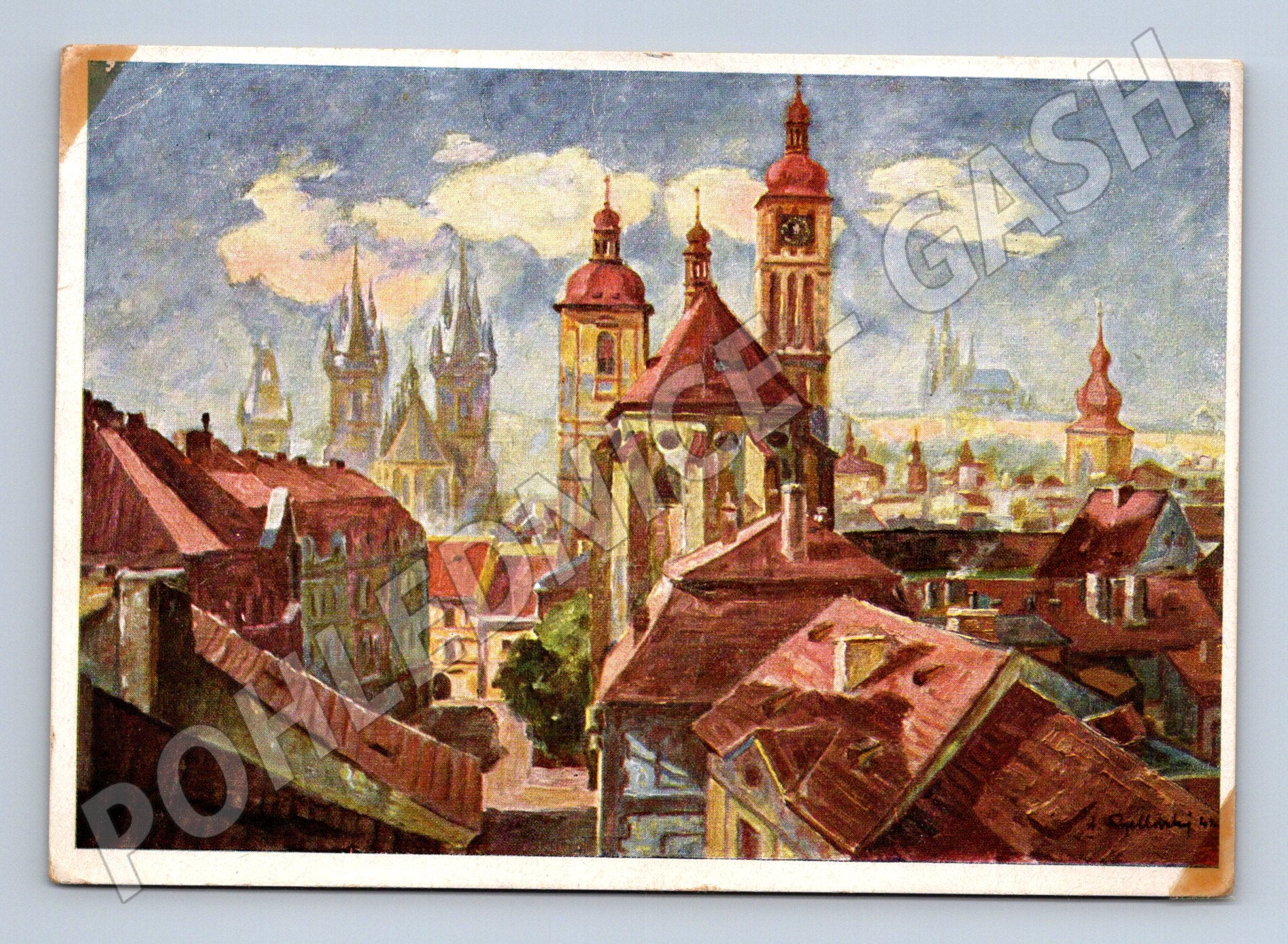 Starší pohlednice s malířským motivem Prahy – Chrám sv. Jakuba a okolní historická architektura Starého Města. Přední strana zdobena malbou střech, věží a panoramatu Prahy, signováno A. Gollub. Na zadní straně ručně psaný text s datem 29. 11. 1951 a originální poštovní známka s razítkem Praha. Pohlednice je mírně opotřebovaná, na okrajích drobné známky stáří, viditelné zejména v rozích. Sbírkově cenný kus s autentickým historickým kontextem a krásnou výtvarnou hodnotou.