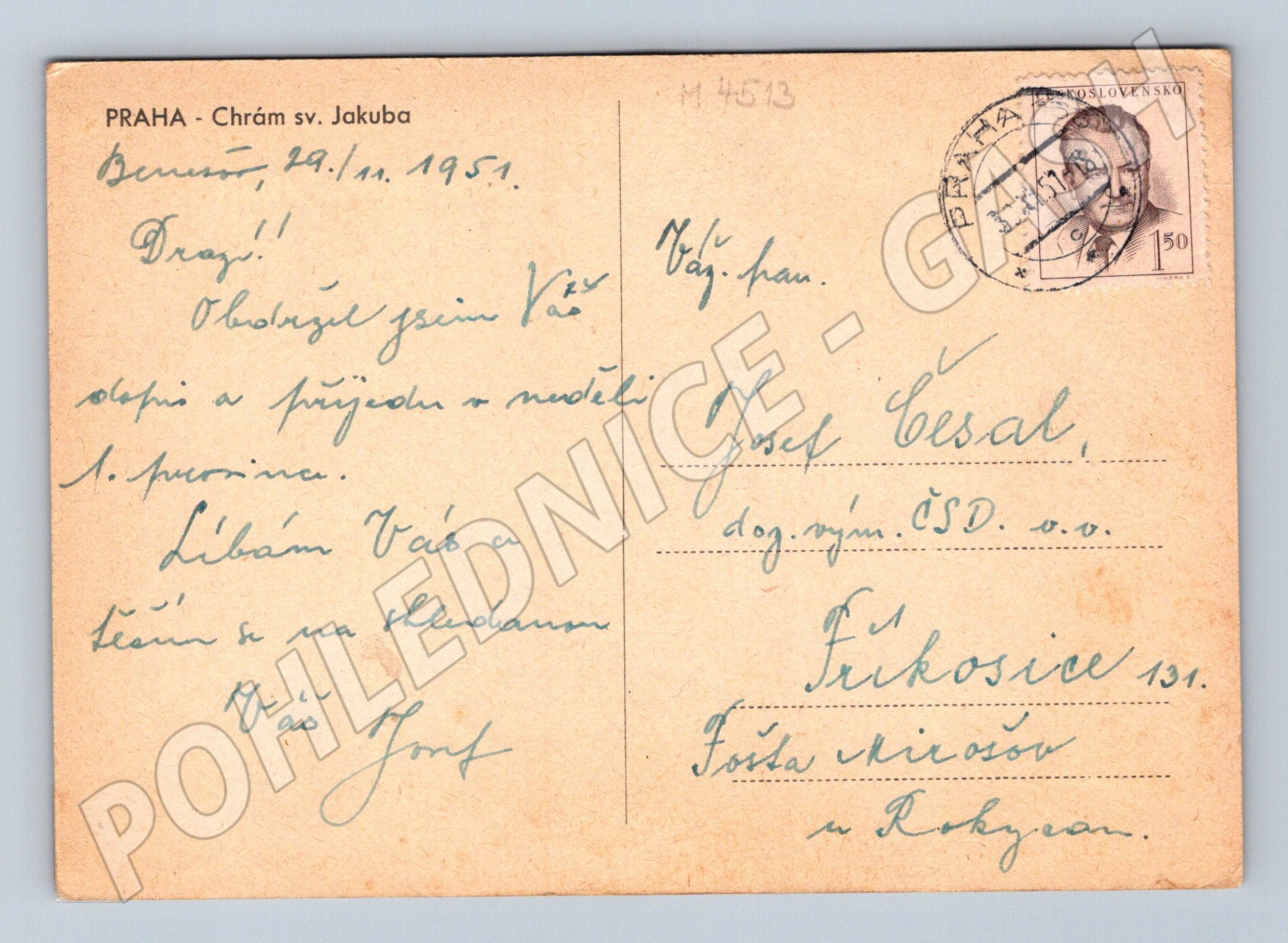 Praha – Chrám sv. Jakuba, malířská pohlednice 1951, poštovní průchod
