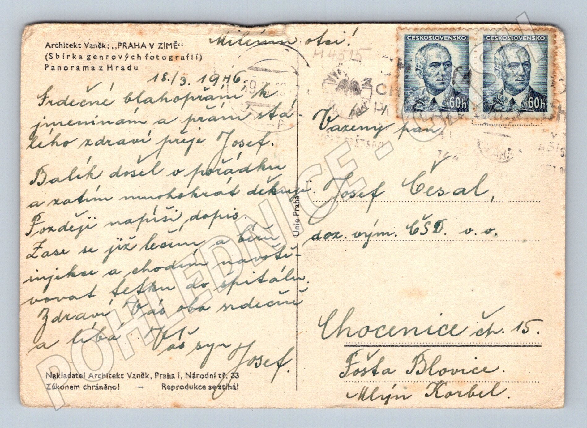 Originální dobová pohlednice z období první poloviny 20. století s názvem Praha v zimě od architekta Vaněčka. Na přední straně je krásná zimní panoramatická fotografie Pražského hradu a okolí, domy pokryté sněhem a siluety věží ukazují typickou atmosféru Prahy v zimním čase. Zadní strana je popsána ručně psaným textem z roku 1941 a opatřena dobovými čs. známkami s portrétem prezidenta Beneše. Pohlednice je v zachovalém sběratelském stavu s menšími známkami opotřebení odpovídajícími stáří. Velmi pěkná pohlednice pro sběratele, milovníky staré Prahy a historických pohledů.