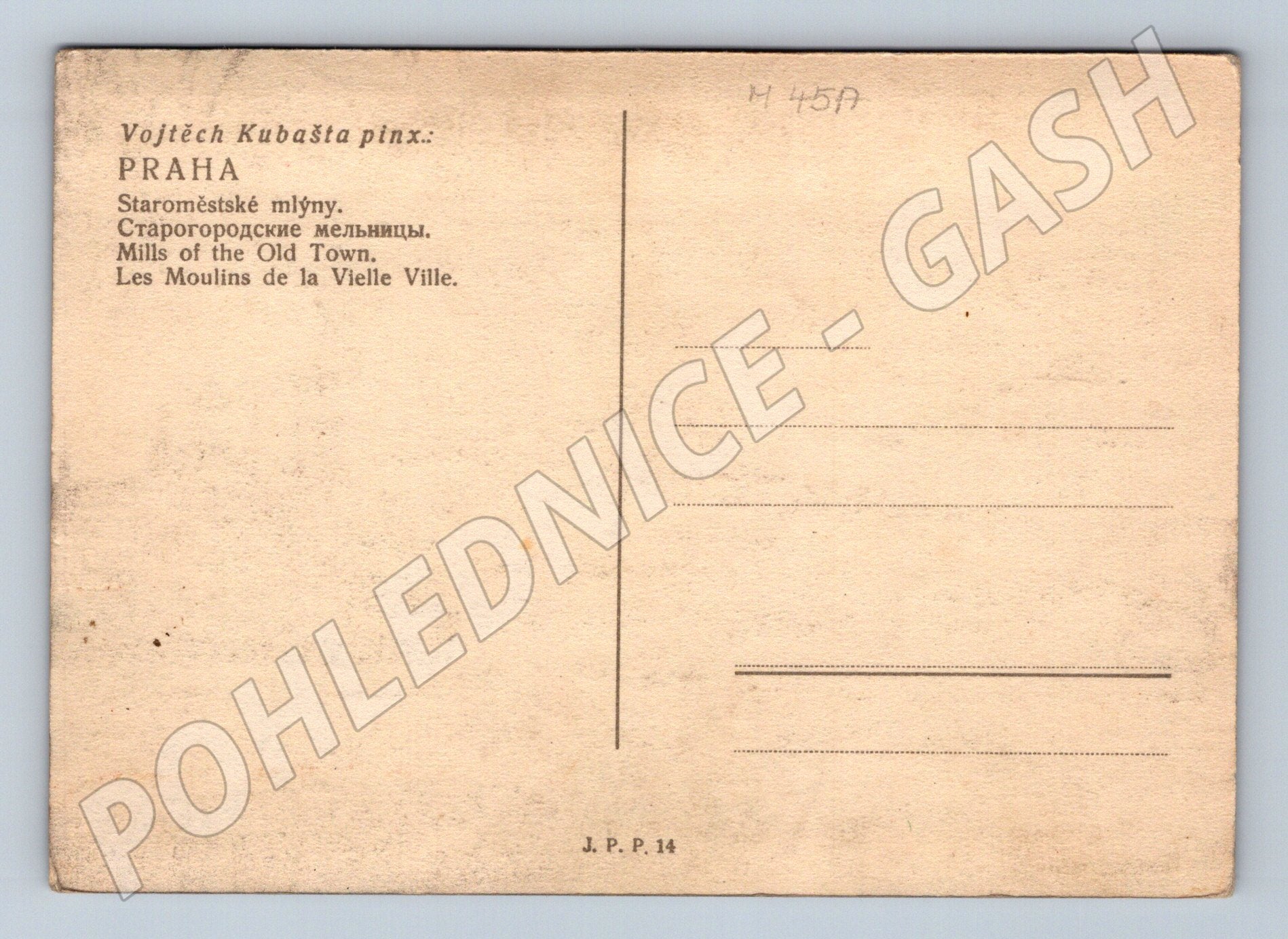 Originální historická pohlednice s malovaným motivem Staroměstských mlýnů v Praze, podle obrazové předlohy Vojtěcha Kubašty. Na přední straně dominuje pohled na pražské Staré Město s ikonickou věží a částí Karlova mostu, vše v jemné pastelové barevnosti. Zadní strana obsahuje popis v několika jazycích (čeština, ruština, angličtina, francouzština) a je neprošlá poštou. Pohlednice je staršího data, vhodná do sbírky nebo jako dárek milovníkům Prahy a historických pohlednic. Rozměr menšího formátu do roku 1950. Stav viz foto – drobné známky stáří a opotřebení na hranách.