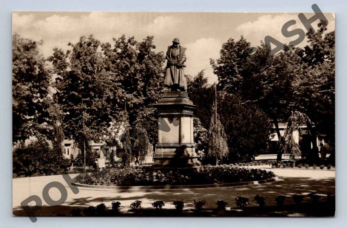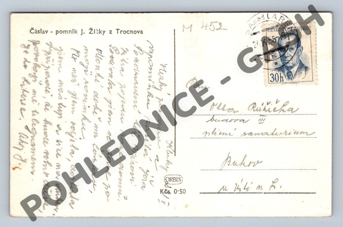 Pohlednice zobrazuje černobílý snímek pomníku J. Žižky z Trocnova v Čáslavi, umístěného v parku se vzrostlými stromy. Pomník zobrazuje postavu husitského vojevůdce Jana Žižky. Na zadní straně pohlednice je psaný adresát, známka Československo s hodnotou 30 haléřů a razítko. Pohlednice je v zachovalém stavu, vhodná pro sběratele historických suvenýrů a milovníky české historie.