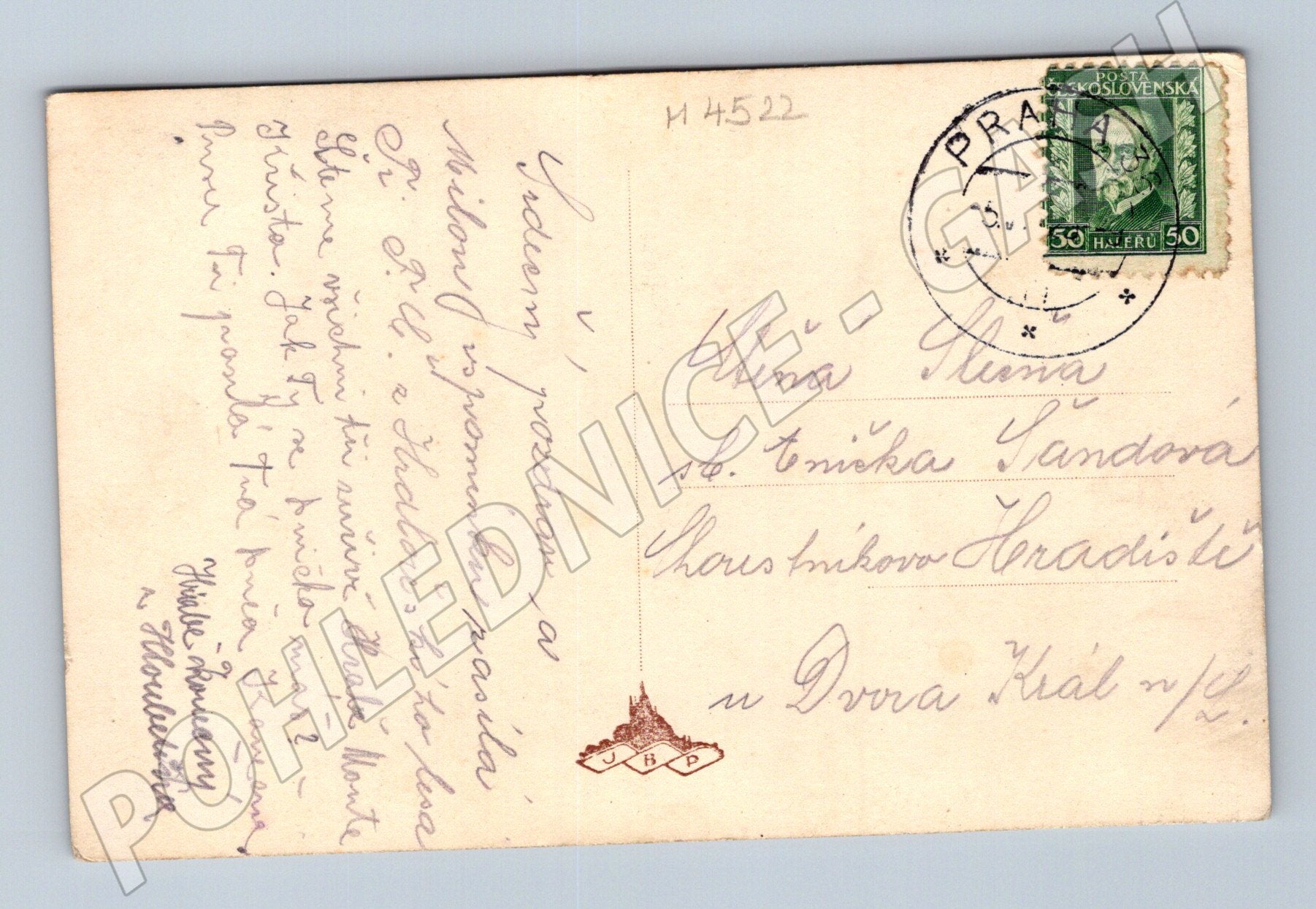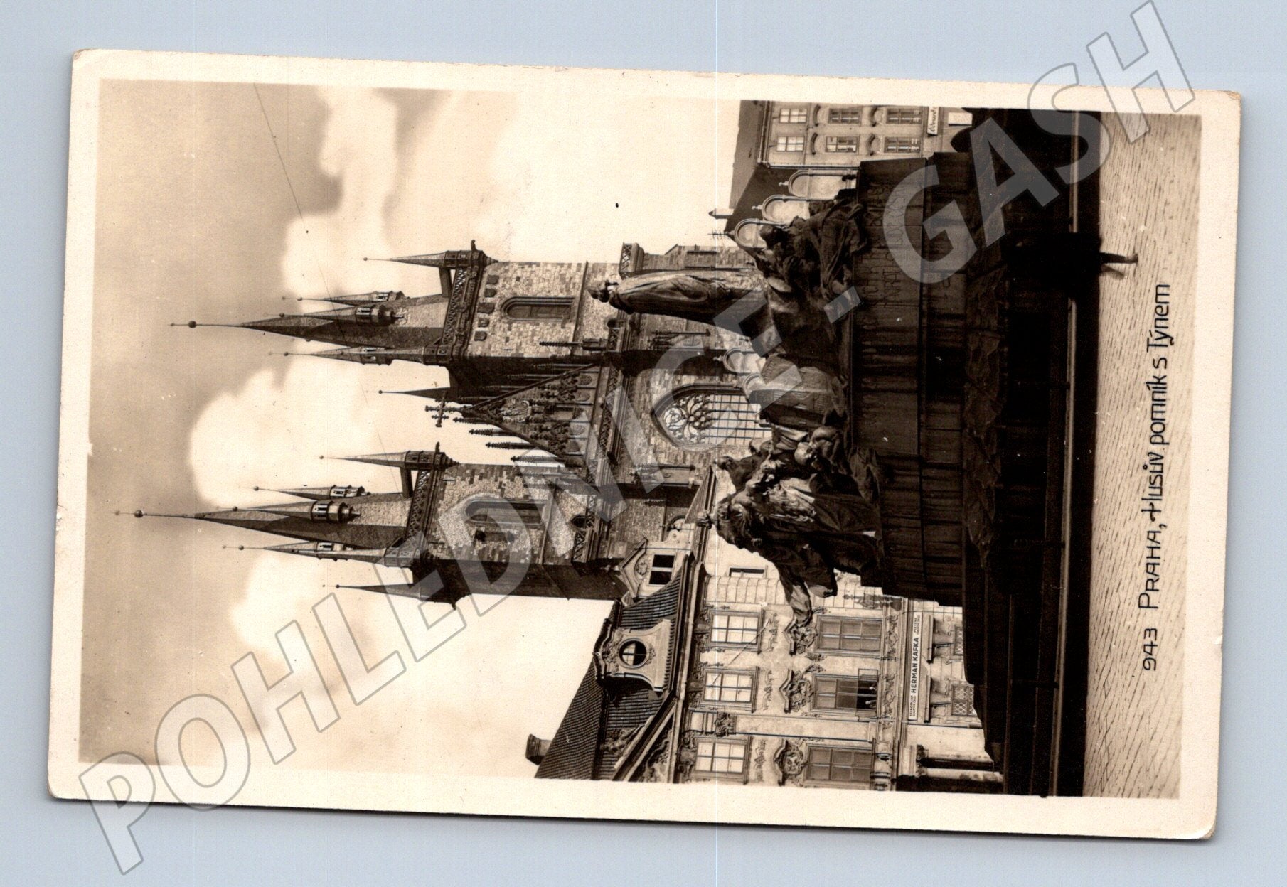 Originální dobová pohlednice z Prahy, zachycující známý Husův pomník na Staroměstském náměstí s Týnským chrámem v pozadí. Pohlednice je černobílá, tištěná kolem první poloviny 20. století. Na zadní straně je rukou psaný pozdrav, adresa a poštovní známka s razítkem PRAHA. Výborný sběratelský stav, vhodné pro sběratele pohlednic z Česka, historických památek či Prahy. Autentická atmosféra i výrazné zachování detailů městské architektury a poštovní historie.