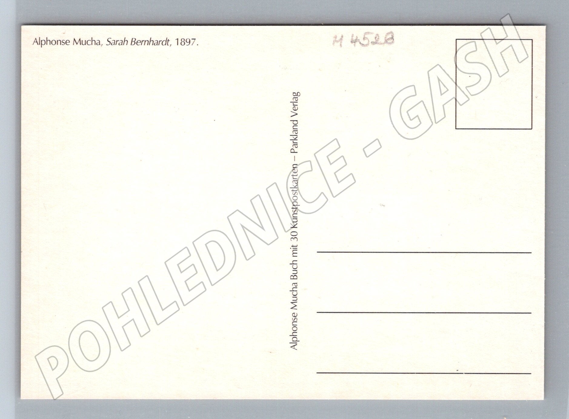 Krásná umělecká pohlednice se slavnou secesní grafikou od Alfonse Muchy s názvem Sarah Bernhardt z roku 1897. Přední strana zobrazuje portrét herečky Sarah Bernhardt s bohatě zdobenými ornamenty a květinami typickými pro Muchův styl. Zadní strana je neprošlá, určena pro odeslání. Vydavatel: Parkland Verlag. Velmi dekorativní pohlednice vhodná do sbírky secesního či uměleckého zaměření, sběratelům i milovníkům výtvarného umění.