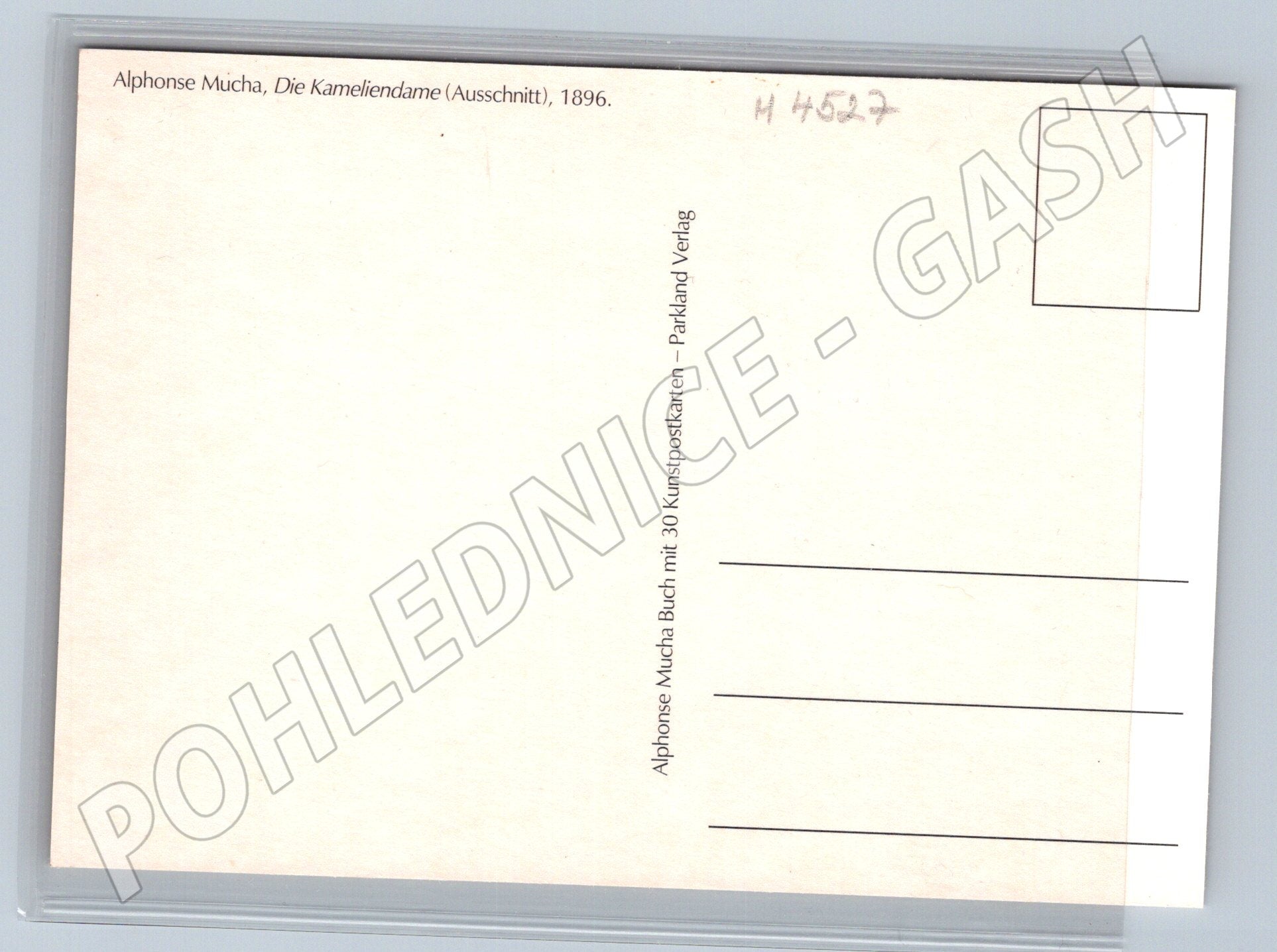 Originální pohlednice s reprodukcí slavného plakátu Alphonse Muchy z roku 1896 – La Dame aux Camélias (Kaméliová dáma), který byl vytvořen pro slavnou herečku Sarah Bernhardt. Pohlednice pochází ze série uměleckých pohlednic vydaných nakladatelstvím Parkland Verlag, což je uvedeno na zadní straně. Pohlednice je ve velmi dobrém stavu, bez popisu, nikdy nebyla odeslána. Ideální sběratelský kousek pro milovníky secese, Alfonse Muchy a dějin malířství.