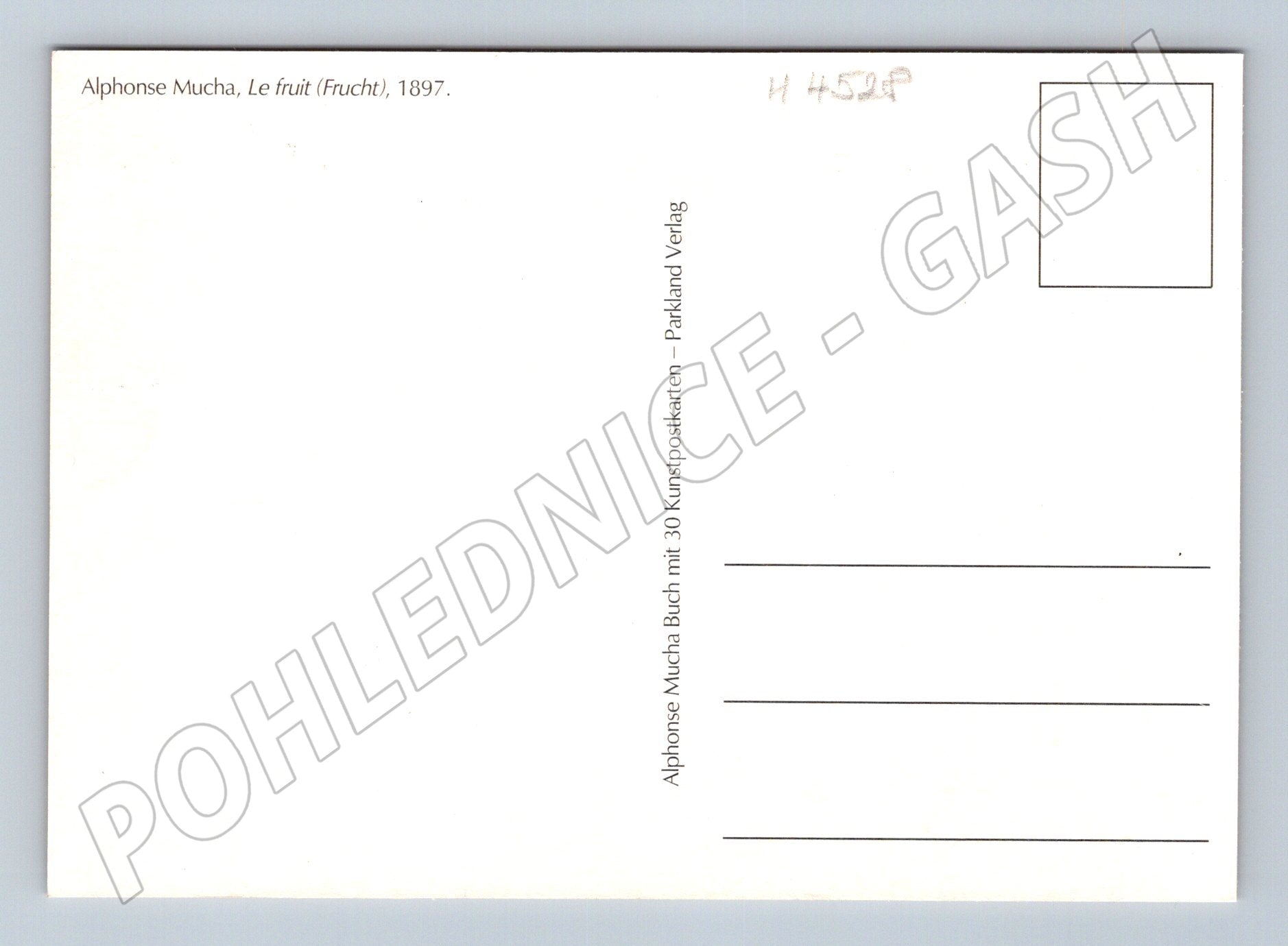 Umělecká pohlednice s motivem díla Le fruit (Frucht) od Alfonse Muchy z roku 1897. Pohlednice je vydána jako součást sběratelské edice Parkland Verlag a zachycuje typický secesní styl Alfonse Muchy, s bohatou ornamentikou a jemnými pastelovými barvami. Na lícové straně je zobrazení elegantní ženy s ovocem, na rubu jsou vyznačeny linky pro adresu a místo pro známku, bez popsaného textu. Pohlednice je ve výborném sběratelském stavu, vhodná pro milovníky umění a secesní tvorby.