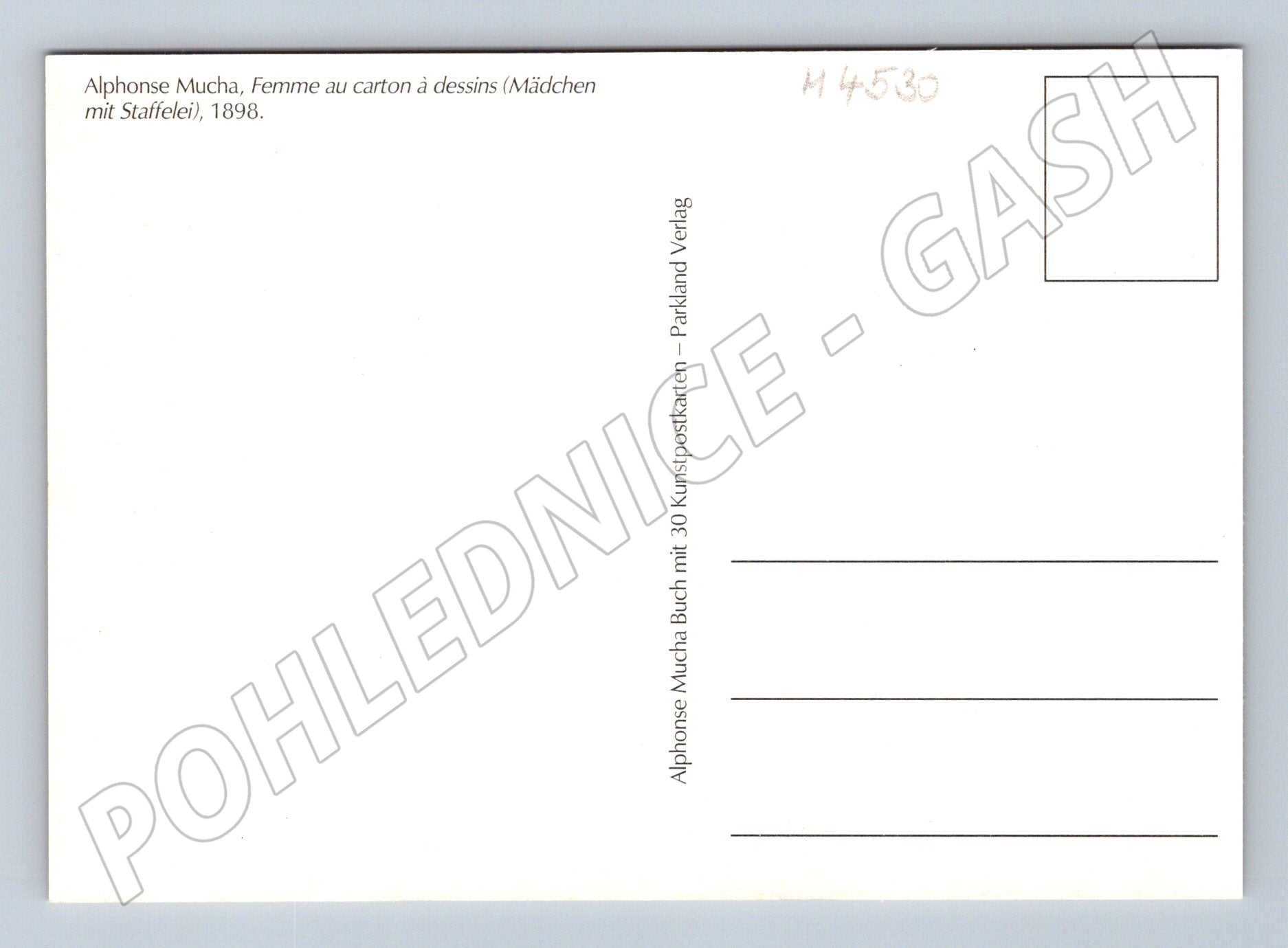 Pohlednice s reprodukcí slavného díla Alphonse Muchy Femme au carton a dessins (1898). Tato krásná pohlednice znázorňuje mladou ženu v typickém secesním stylu, s bohatými dekorativními motivy a výraznými květinovými vzory v pozadí. Jde o reprodukci jedné z prací předního umělce období secese, známého zejména svými plakáty, ornamentální tvorbou a působivou barevností. Rub pohlednice je nepsaný, s popisem díla a místem pro známku a adresu. Pohlednice je vhodná pro sběratele, obdivovatele secese nebo milovníky umění 19. století.
