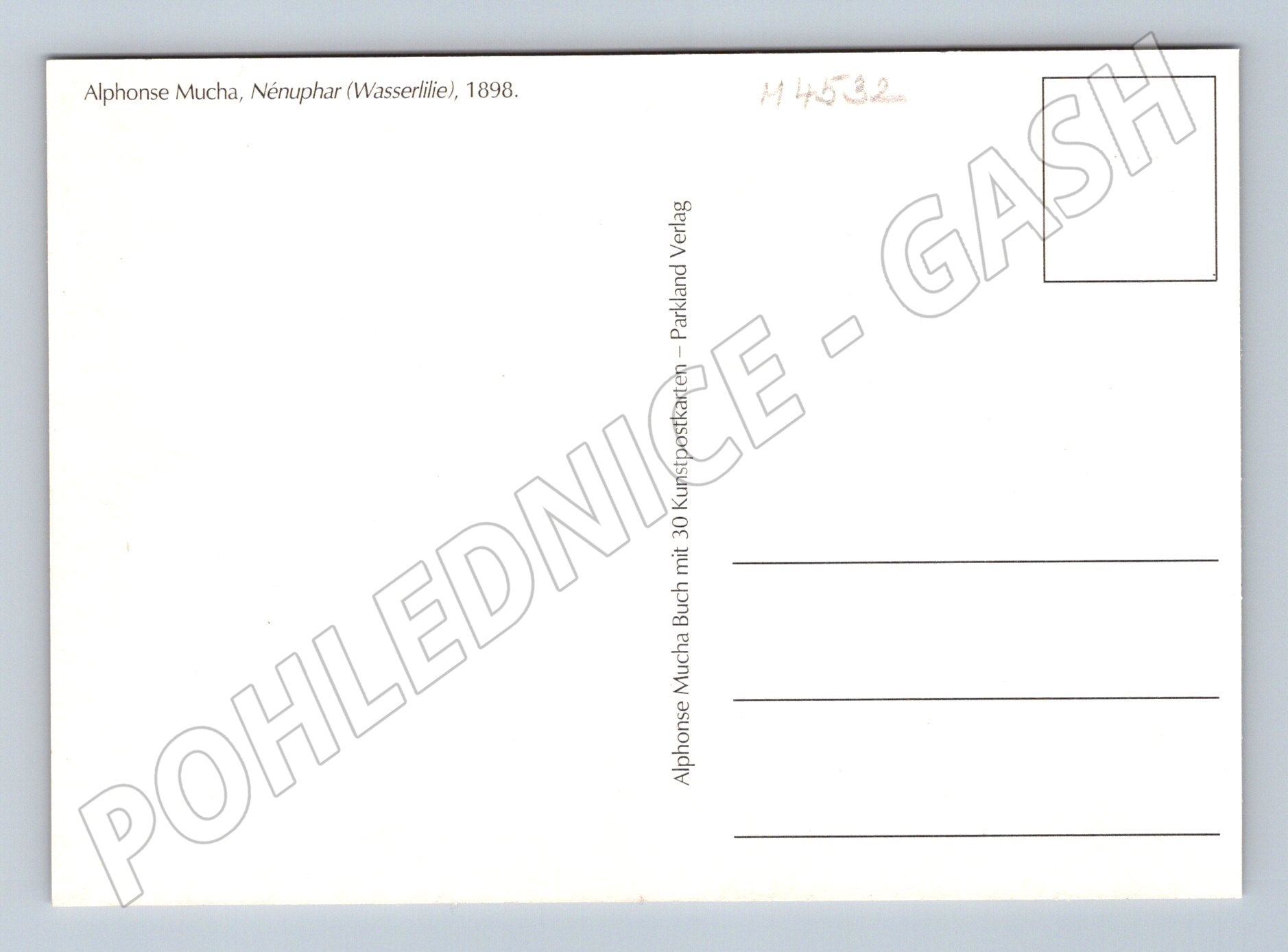 Umělecká pohlednice s motivem díla Alphonse Muchy – Nénuphar (Wasserlilie) z roku 1898. Znázorňuje ženu v secesním stylu, která natahuje ruku po leknínu na vodní hladině, v pozadí zapadající slunce. Bohaté rámy s květinovým dekorem a typická pastelová barevnost. Zadní strana pohlednice je nepsaná, s popisem díla a vydavatele – Parkland Verlag. Ideální pro sběratele uměleckých pohlednic a příznivce secesního umění. Stav velmi dobrý, bez poškození.
