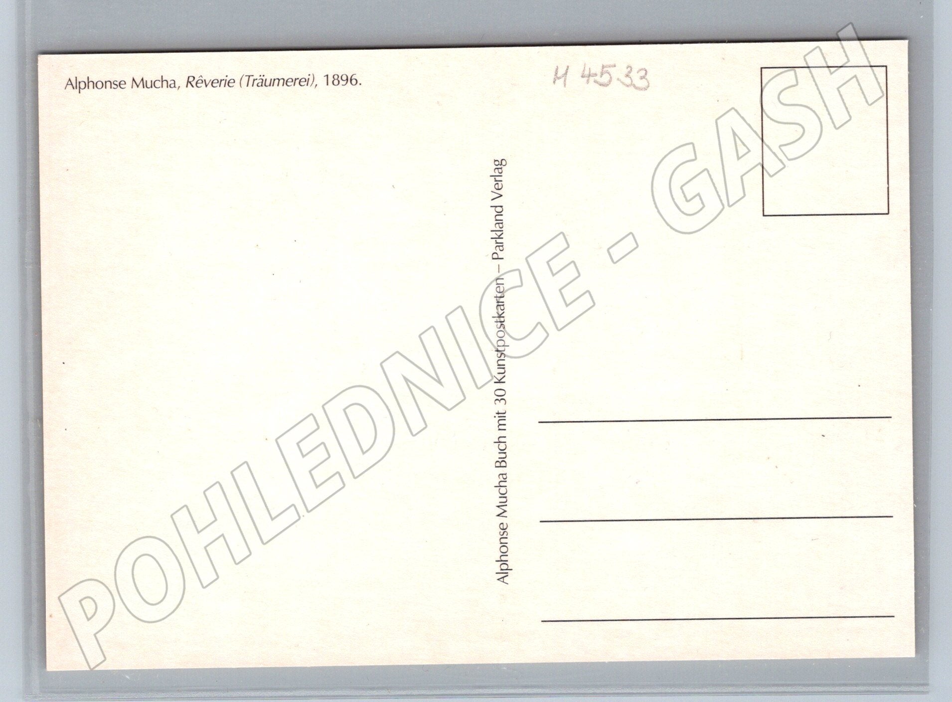 Nabízím pohlednici s reprodukcí slavného obrazu Alphonse Muchy „Reverie (Träumerei)“ z roku 1896. Pohlednice pochází z edice Parkland Verlag, kde byla součástí sběratelské sady „Alphonse Mucha Buch mit 30 Kunstpostkarten“. Na zadní straně je uveden autor a název díla, prostor pro známku a adresu. Samotná pohlednice je neprošlá, v perfektním stavu. Krásná ukázka secesního umění, vhodná do sbírky nebo jako hodnotný dárek pro milovníky Muchovy tvorby.