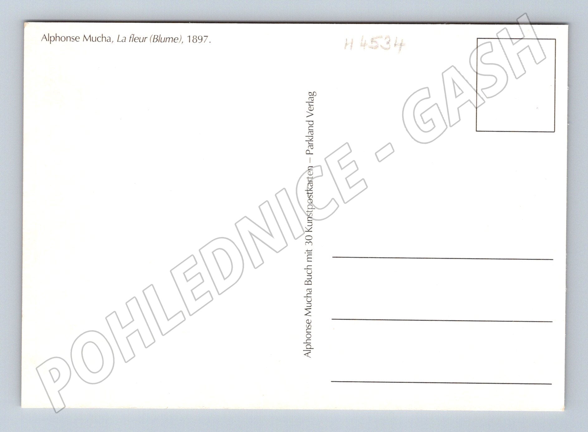 Pohlednice s reprodukcí slavného díla Alphonse Muchy - La fleur (Blume) z roku 1897. Umělecká pohlednice typická pro secesní styl, zachycuje ženskou postavu obklopenou květinami a bohatými ornamenty. Z druhé strany je pohlednice nepopsaná, vydaná jako součást sběratelské edice Parkland Verlag. Skvělý přírůstek do sbírky pohlednic zaměřených na české malířství a secesní umění.