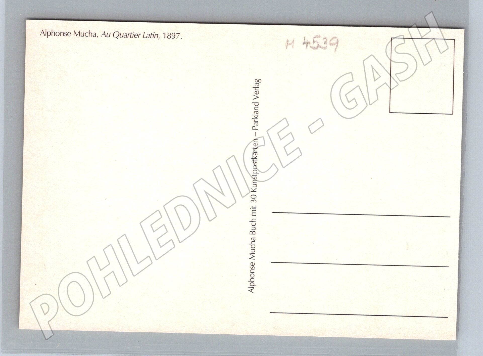 Umělecká pohlednice s motivem slavného díla Au Quartier Latin od Alfonse Muchy z roku 1897. Na přední straně je reprodukce tohoto ikonického secesního plakátu v typických pastelových barvách s ozdobnými kruhovými a květinovými prvky a ženskou postavou. Zadní strana je nevyplněná, s popiskem Alphonse Mucha, Au Quartier Latin, 1897 a informací o vydavateli (Parkland Verlag). Pohlednice je zachovalá a vhodná do sbírky umění nebo pro milovníky secesní grafiky. Originální motiv ilustruje významnou éru evropského malířství na přelomu 19. a 20. století.