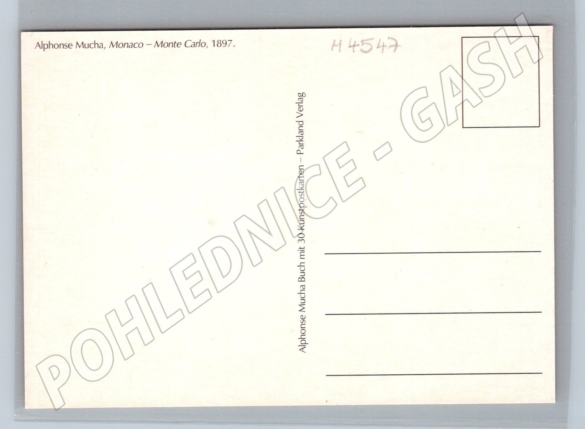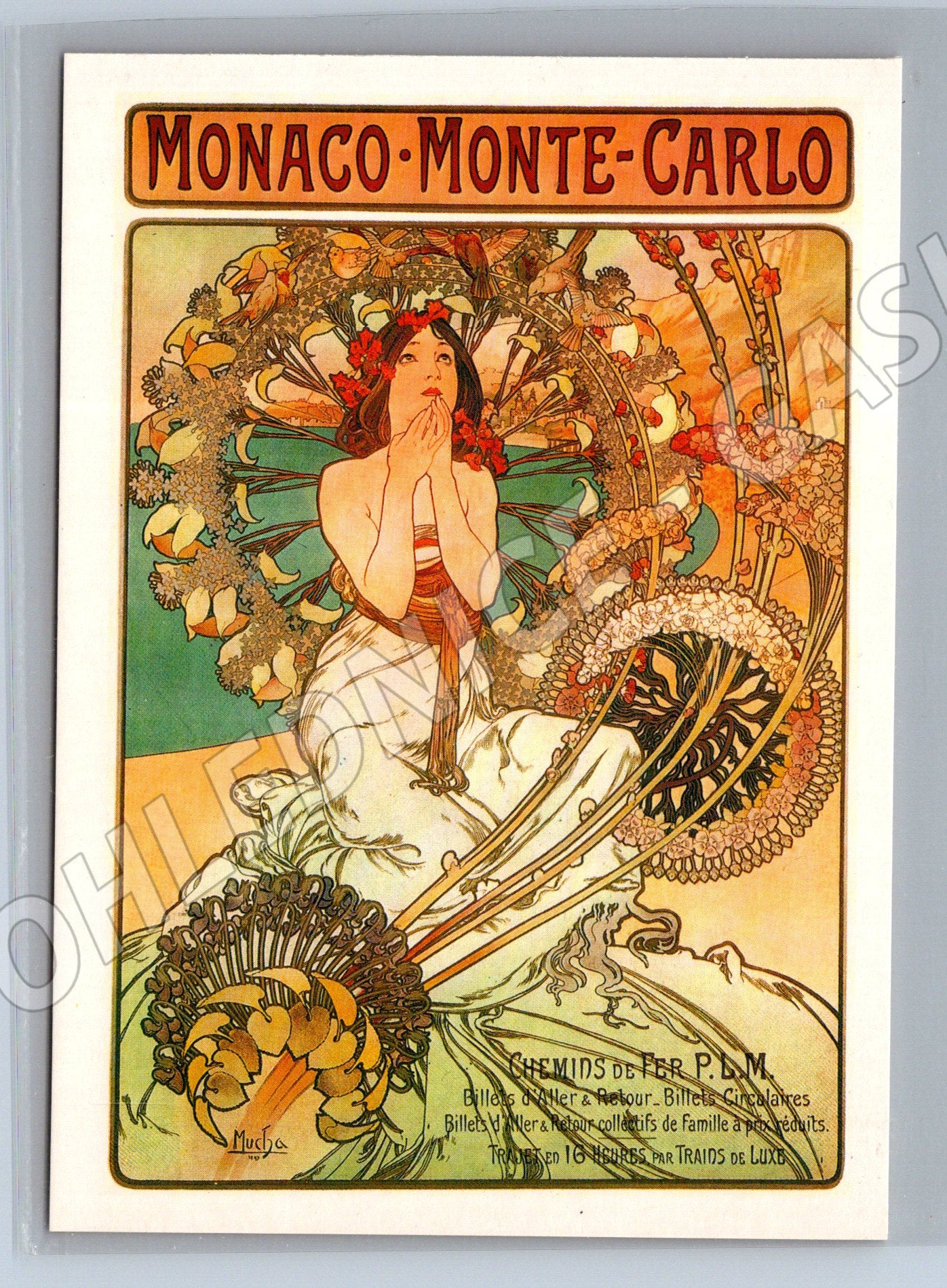 Pohlednice s motivem slavného plakátu Monaco - Monte Carlo od Alfonse Muchy z roku 1897. Na přední straně se nachází mistrovské secesní ztvárnění ženy obklopené květinovými ornamenty, typické pro Muchovu tvorbu. Zadní strana je nepopsaná, v horní části je uvedeno jméno autora a název díla. Jedná se o novodobý tisk, vhodný pro sběratele uměleckých pohlednic nebo obdivovatele secesního umění. Velmi pěkný stav.