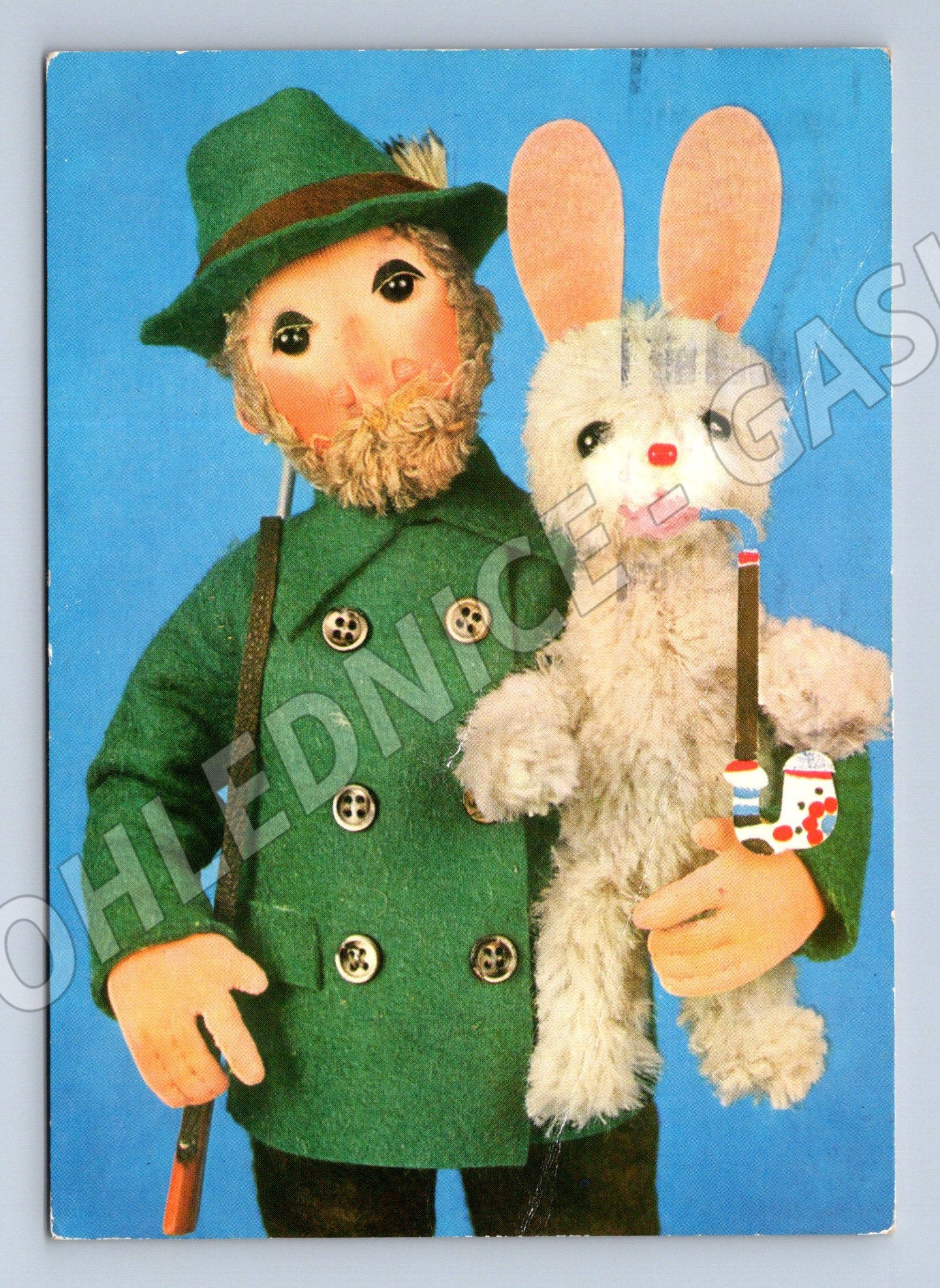 Pohlednice maňásci – myslivec a zajíc, ČSR, 1970, Orbis