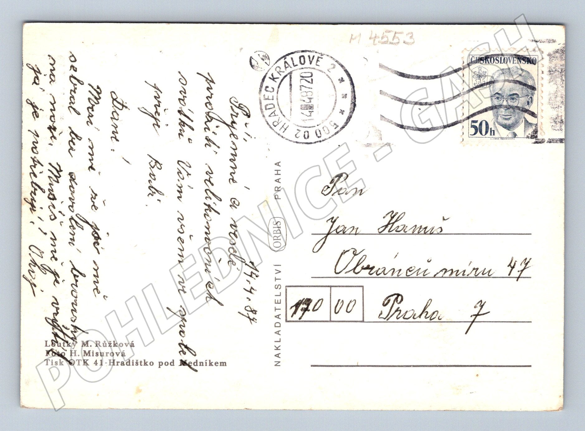 Originální pohlednice z Československa s motivem maňásků – myslivce a zajíce s flétnou. Barevná ilustrace na přední straně potěší sběratele i milovníky retro pohlednic. Zadní strana je popsána a opatřena známkou v nominální hodnotě 50 haléřů, orazítkovaná poštou Hradec Králové v roce 1970. Vydavatel: Orbis Praha, tisk OTK 41 Hradištko pod Medníkem. Ilustrace: M. Růžková, fotografie H. Misurová. Vhodné do sbírky českých pohlednic nebo jako originální sběratelský kousek.