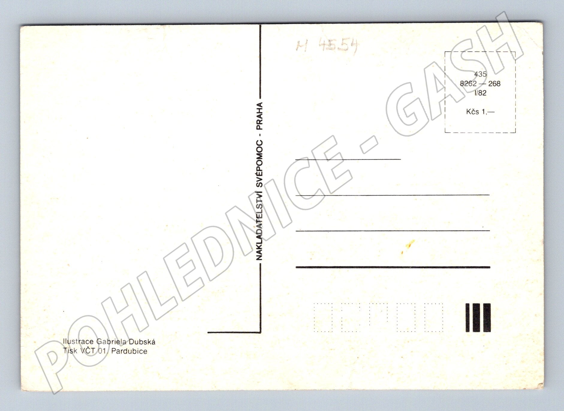 Nabízím originální pohlednici s motivem populárních dětských postav Makové panenky a motýla Emanuela. Na lícové straně je barevná ilustrace od Gabriely Dubské, která patří k české klasice animované tvorby pro děti. Na zadní straně je pohlednice neprošlá, s místem pro adresu a poštovní známku. Vydáno nakladatelstvím Svépomoc, Praha, tisk VČT 01 Pardubice. Výborný stav, vhodné pro sběratele i milovníky české animace. Rok vydání 1982, formát cca 14,8 x 10,5 cm.