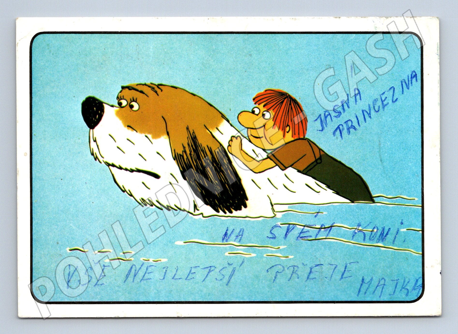 Originální pohlednice ze série Maxipes Fík, známé české televizní pohádky, vytvořené malířem Jiřím Šalamounem. Na pohlednici je oblíbený Maxipes Fík s postavičkou Ájou na zádech, jak plují po vodě. Pohlednice byla vydána vydavatelstvím v Praze, tisk Severografia Děčín. Na přední straně je ručně dopsaný vzkaz. Stav pohlednice odpovídá běžnému použití, viz fotografie. Sbírkový kousek pro fanoušky českých večerníčků a nostalgické sběratele.