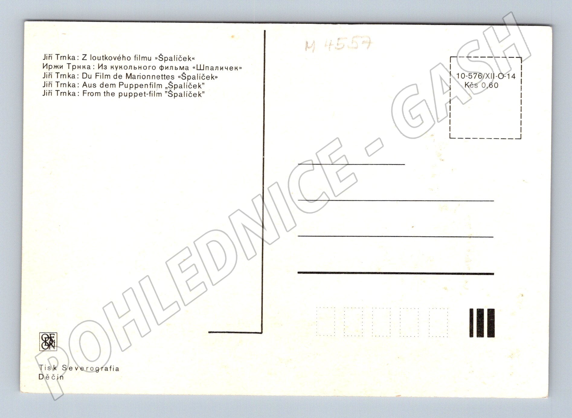 Originální pohlednice s motivem z loutkového filmu Jiřího Trnky Špalíček . Na přední straně je zobrazen loutkový chlapec a charakteristické kulisy filmu – strom a trakař na pozadí oblohy. Na zadní straně nechybí popis v několika jazycích, potvrzující původ pohlednice z tohoto významného českého animovaného díla. Vydala Severografia Děčín, cena 0,60 Kčs. Velmi oblíbená sběratelská pohlednice pro milovníky české kinematografie i animace. Vhodná do sbírky, dekorace nebo jako dárek.