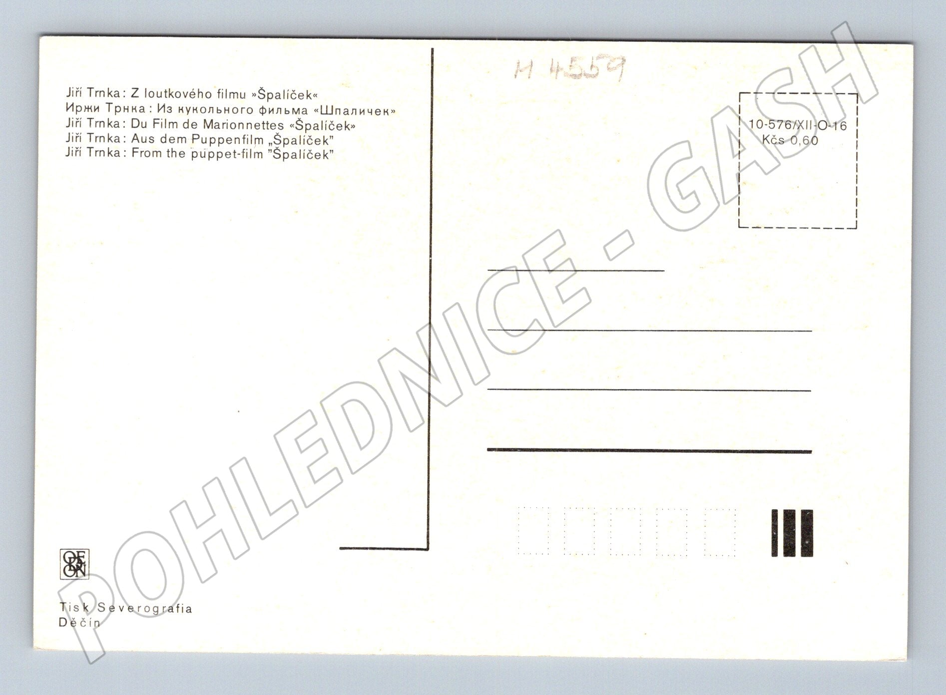 Originální pohlednice s motivem loutkového filmu Špalíček od známého českého umělce Jiřího Trnky. Na přední straně je barevná fotografie loutek z filmu v idylickém venkovském prostředí s chalupou a vozem v pozadí. Na zadní straně je informace v několika jazycích o původu motivu (Jiří Trnka: Z loutkového filmu Špalíček ). Pohlednice neprošlá poštou, bez známky a textu. Cena 0,60 Kčs. Vydal tisk Severografia, Děčín. Skvělý kousek pro sběratele české animace a pohlednic. Stav velmi dobrý, viz foto.