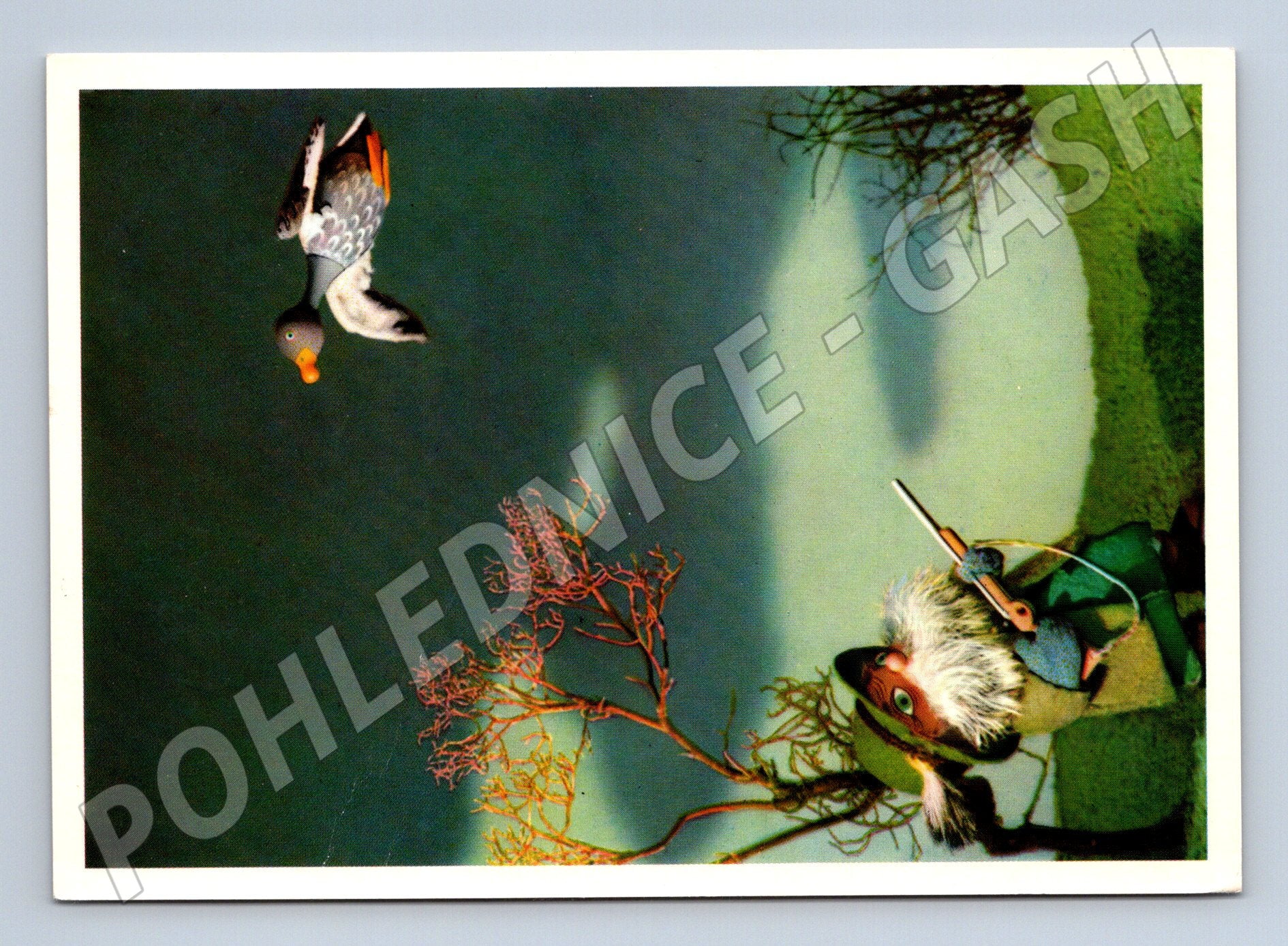 Originální pohlednice se scénou z loutkového filmu Špalíček od slavného výtvarníka Jiřího Trnky. Na lícní straně pohlednice je zachycena malovaná scéna s loutkovou postavou lovce se zbraní a letící kachnou v malebném přírodním prostředí. Zadní strana obsahuje informace o autorovi a filmu v několika jazycích. Pohlednice je vytištěna tiskárnou Severografia Děčín. Jedná se o krásný sběratelský kousek, který ocení milovníci výtvarného umění, animace a české kultury. Stav viz foto, nevpisovaná.