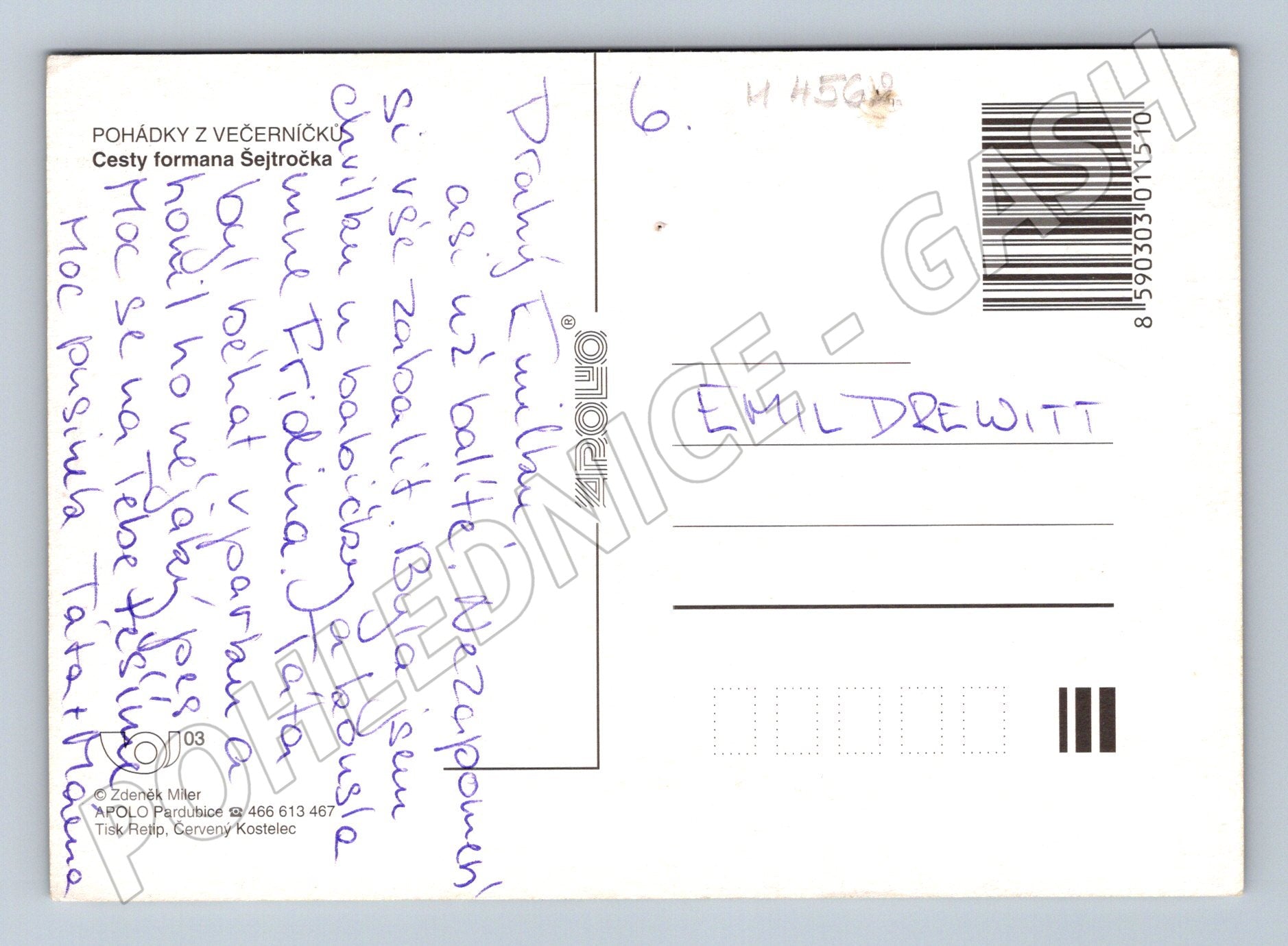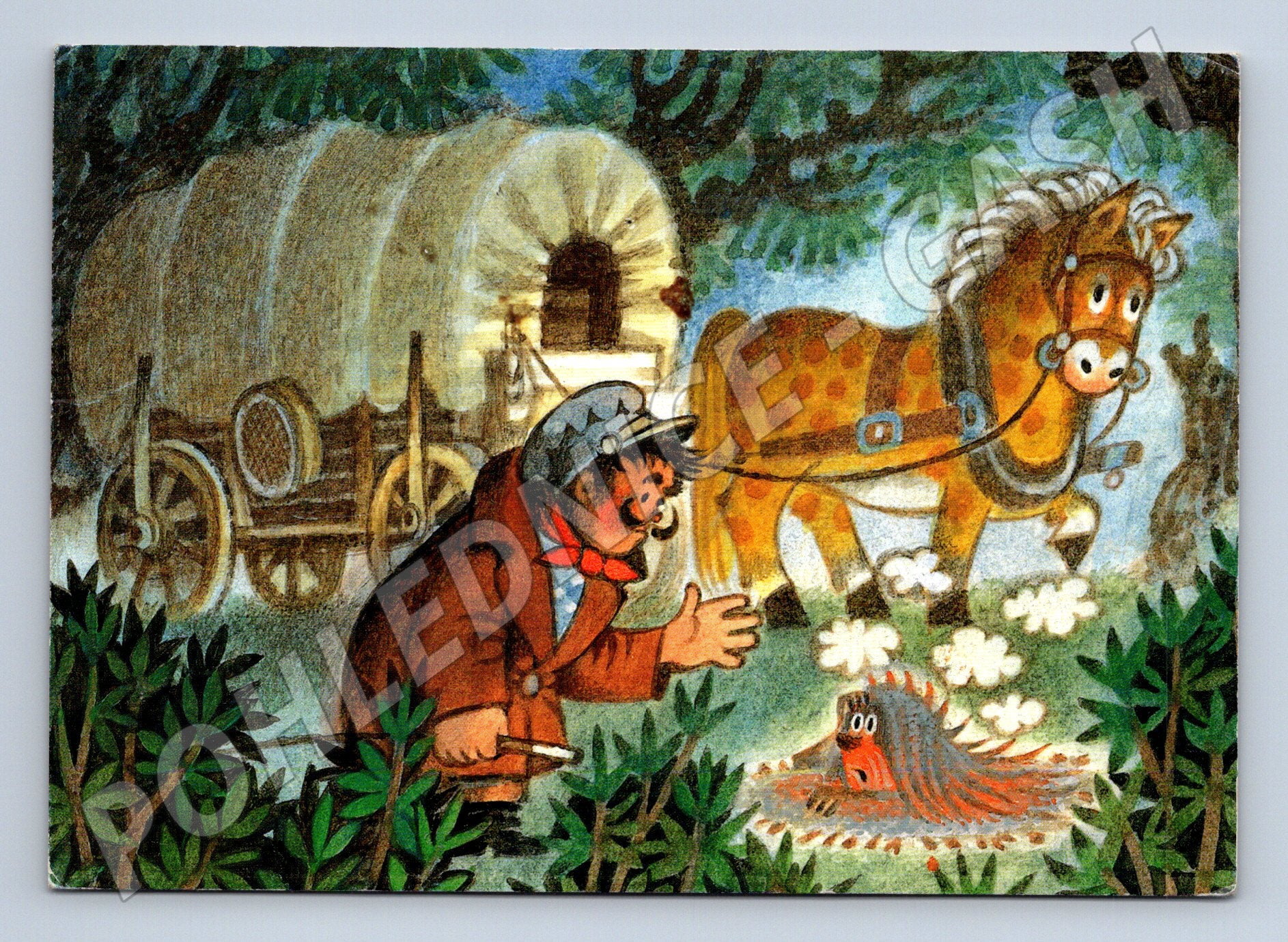 Originální pohlednice s ilustrací od Zdeňka Milera ze série Pohádky z večerníčku – Cesty formana Šejtročka . Na obrázku je zobrazen forman s koněm a krysaříkem u cesty, typický humorný styl a detailní kresba. Na zadní straně je ručně psaný vzkaz. Stav velmi dobrý, bez výraznějšího poškození. Pohlednice je tištěná v ČR, vydal APOLLO Pardubice. Vhodné pro sběratele večerníčkových pohádek a milovníky ilustrací Zdeňka Milera.