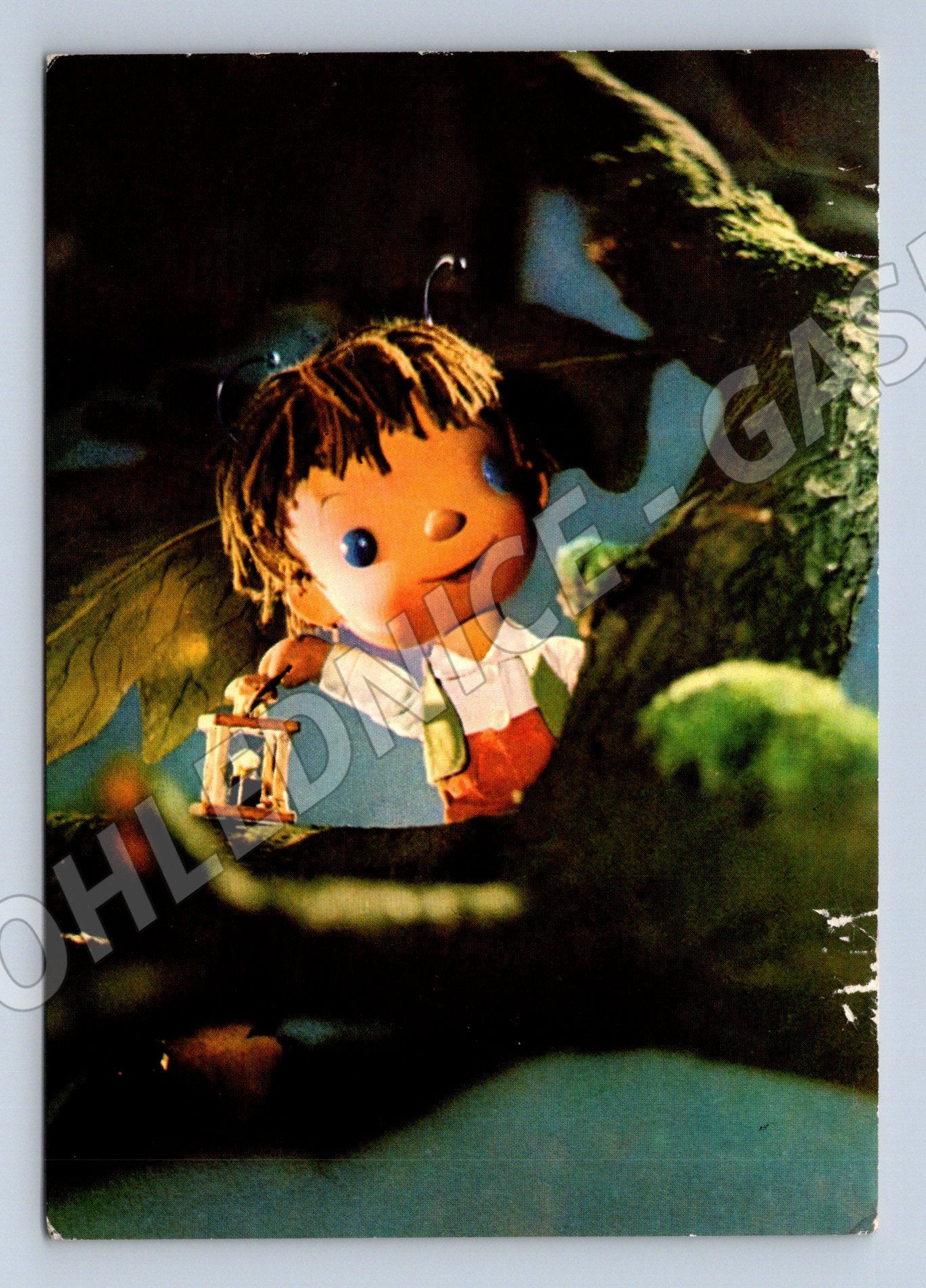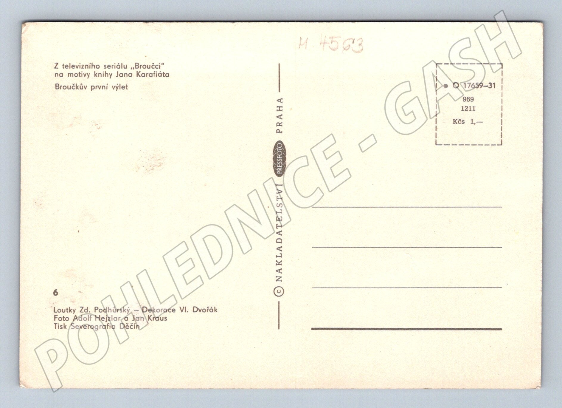 Originální pohlednice s motivem z populárního československého televizního seriálu Broučci na motivy knihy Jana Karafiáta – Broučkův první výlet. Na přední straně je barevný snímek z inscenace, na zadní informace o výrobě (loutky Z. Podhůrský, dekorace VI. Dvořák, foto Adolf Hejzlar a Jan Kraus, tisk Severografia Děčín). Pohlednice je ve velmi pěkném stavu, bez popisu, neprošlá poštou, určeno pro sběratele i milovníky české kultury a pohádek.