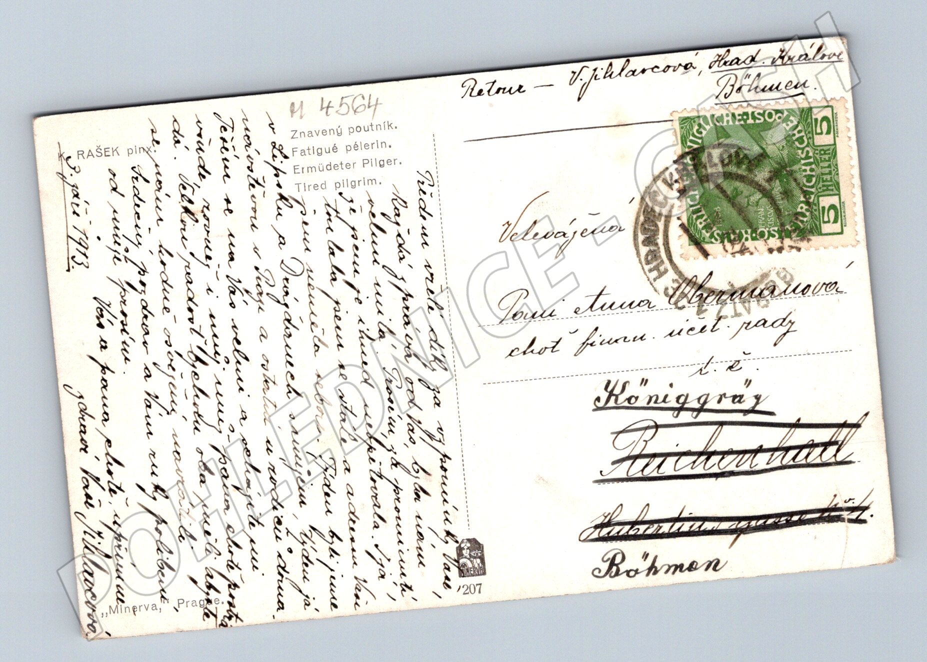 Starobylá pohlednice s uměleckým motivem - znavený poutník od výtvarníka Rašek. Pohlednice byla odeslaná, s poštovní známkou, ručně psaným vzkazem a datací z roku 1913. Na pohlednici je zachycen poutník odpočívající u cesty v malebné krajině. Text je ve více jazycích (česky, německy, francouzsky), vydavatel Minerva, Praha. Skvělý sběratelský kousek pro milovníky starých uměleckých pohlednic. Stav odpovídá stáří, viz foto.