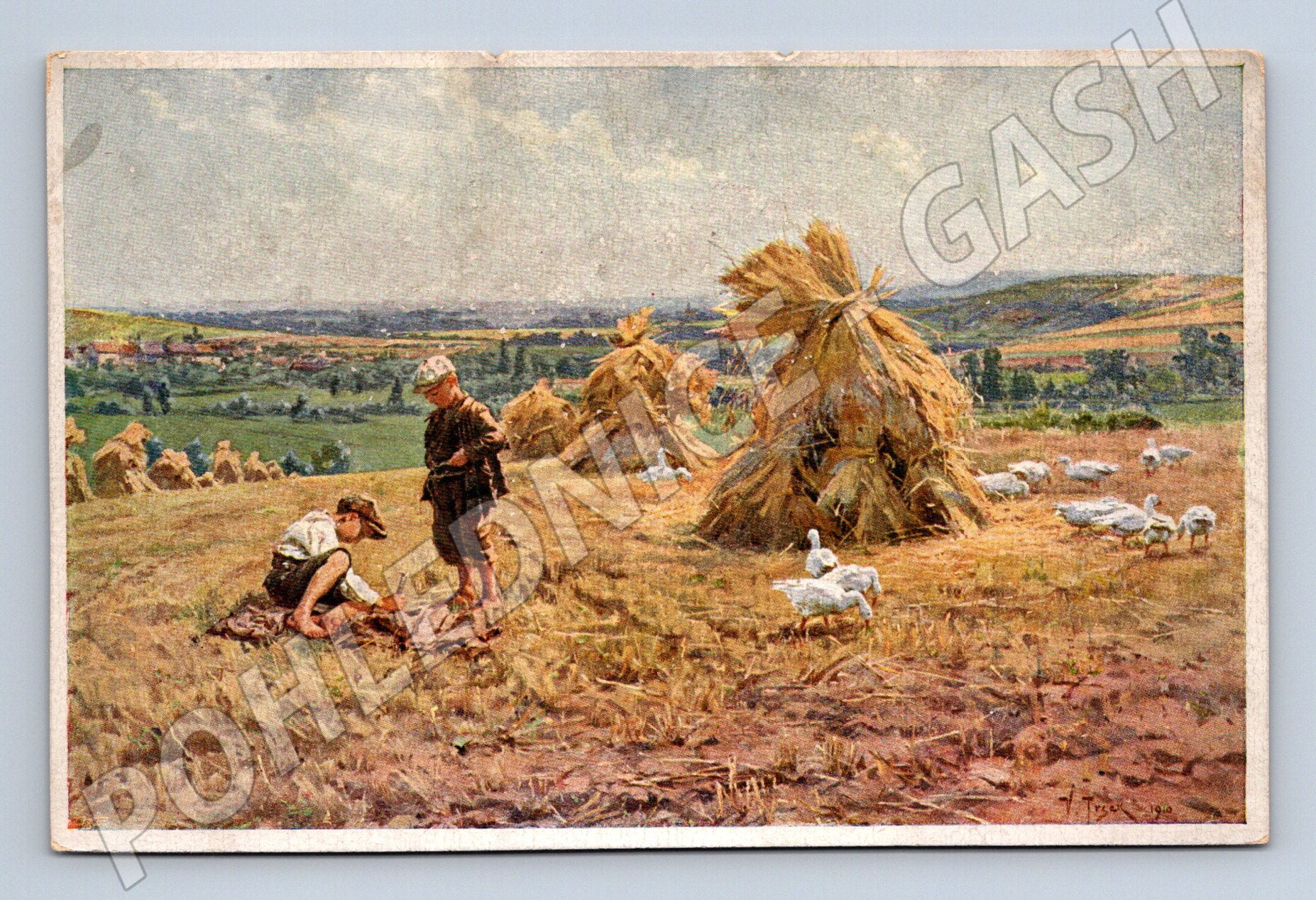 Pohlednice s motivem venkovské sklizně a pasení husí. Na přední straně je barevná ilustrace zachycující tradiční českou krajinu se dvěma dětmi na poli, několika snopy obilí, pasoucími se husami a malebným výhledem do krajiny. Pohlednice působí idylicky a dokumentuje každodenní život na venkově začátku 20. století. Zadní strana je čistá, bez popisu či známky, pouze s číselným označením tužkou. Stav odpovídá stáří, pohlednice je vhodná pro sběratele etnografických a historických pohlednic.