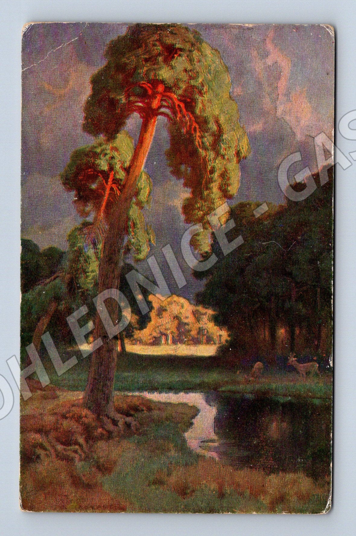 Originální stará pohlednice s malovaným motivem krajiny – strom u řeky či jezera za soumraku. Pohlednice byla poslána poštou, na zadní straně je ručně psaný text, razítko Batterie a známky opotřebení z doby používání. Jedná se o sběratelsky zajímavý kus z období počátku 20. století, vhodný pro milovníky vintage pohlednic a krajinomalby. Stav odpovídá stáří – viz foto. Ideální do sbírky nebo jako dekorace.