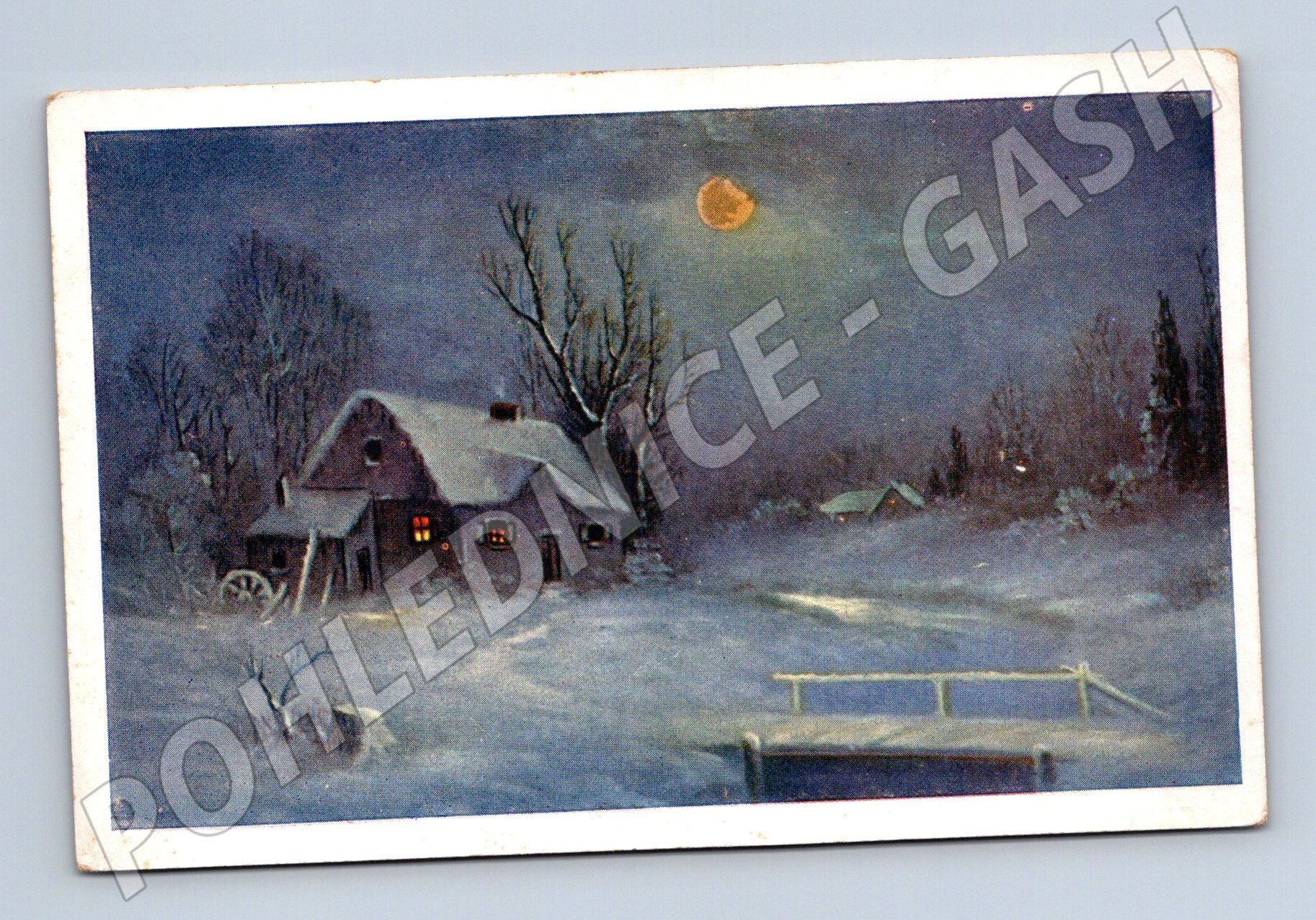 Originální stará pohlednice menšího formátu zobrazující zimní noční krajinu se zasněženým venkovským stavením pod měsícem. V oknech domu svítí teplé světlo, které kontrastuje s chladnou atmosférou zasněžené scenérie. Pohlednice nebyla použita, má čistou adresní stranu. Vydáno ve prospěch Domu milosrdenství Vincentinum , Praha-Břevnov. Pohlednice je v zachovalém sběratelském stavu s drobnými známkami stáří. Vhodné pro sběratele historických pohlednic a milovníky zimních motivů.