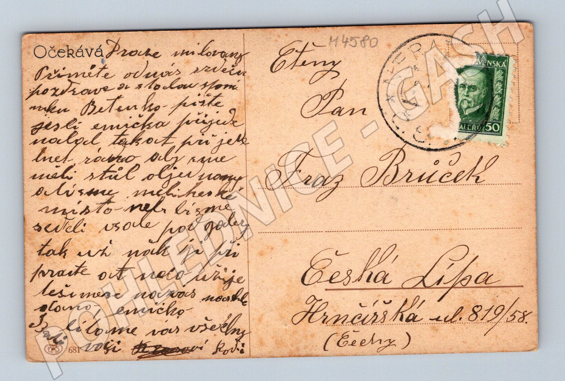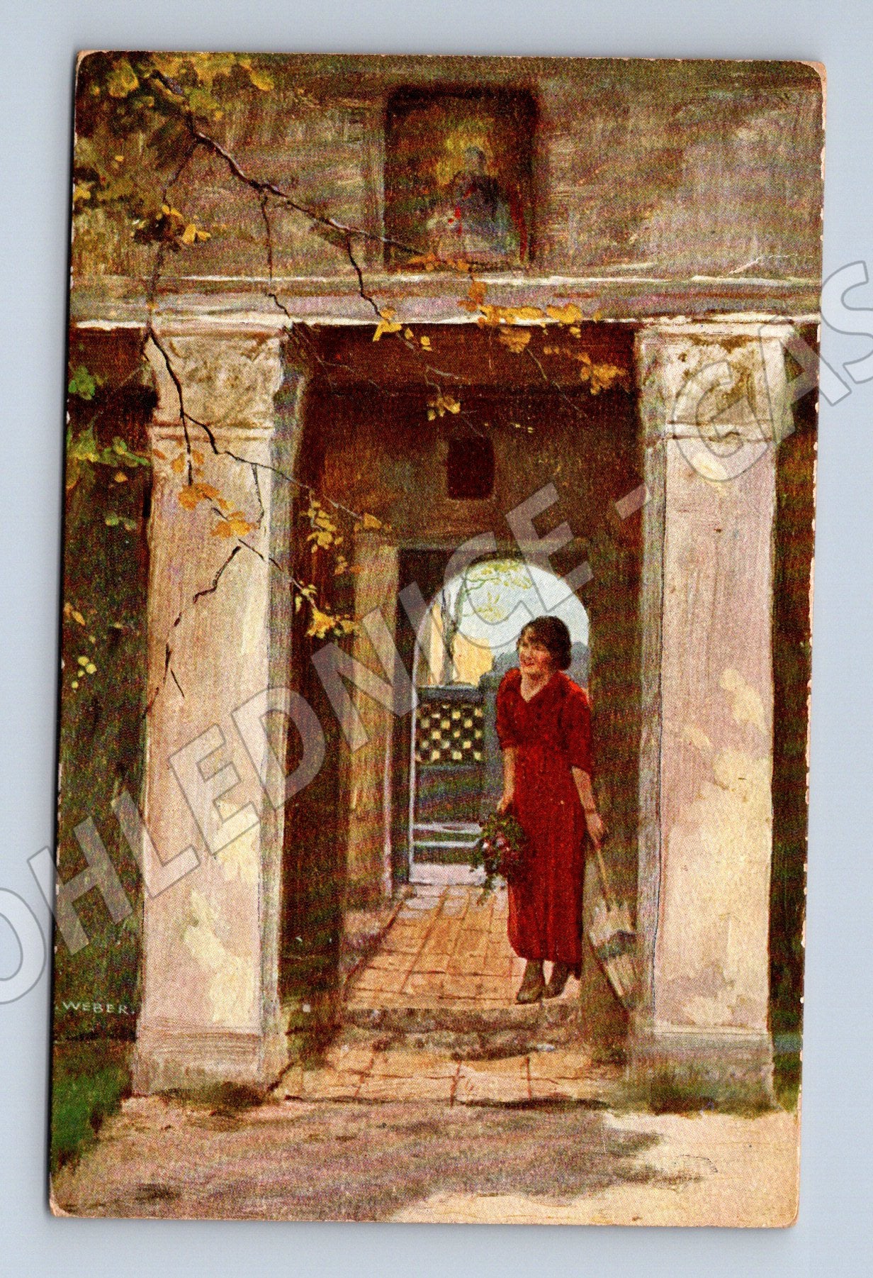 Originální stará pohlednice se zobrazením dívky na ochozu hradu nebo zámku, s malovaným výjevem, signováno v rohu. Na zadní straně je čitelný text psaný perem, adresa a známka s razítkem. Pohlednice byla zaslána do České Lípy, nese známky stáří a běžné opotřebení odpovídající stáří. Jedná se o sběratelsky atraktivní kousek s krásnou kresbou atmosférického prostředí českého historického objektu. Format klasický, barevný tisk, velmi dekorativní do sbírky!