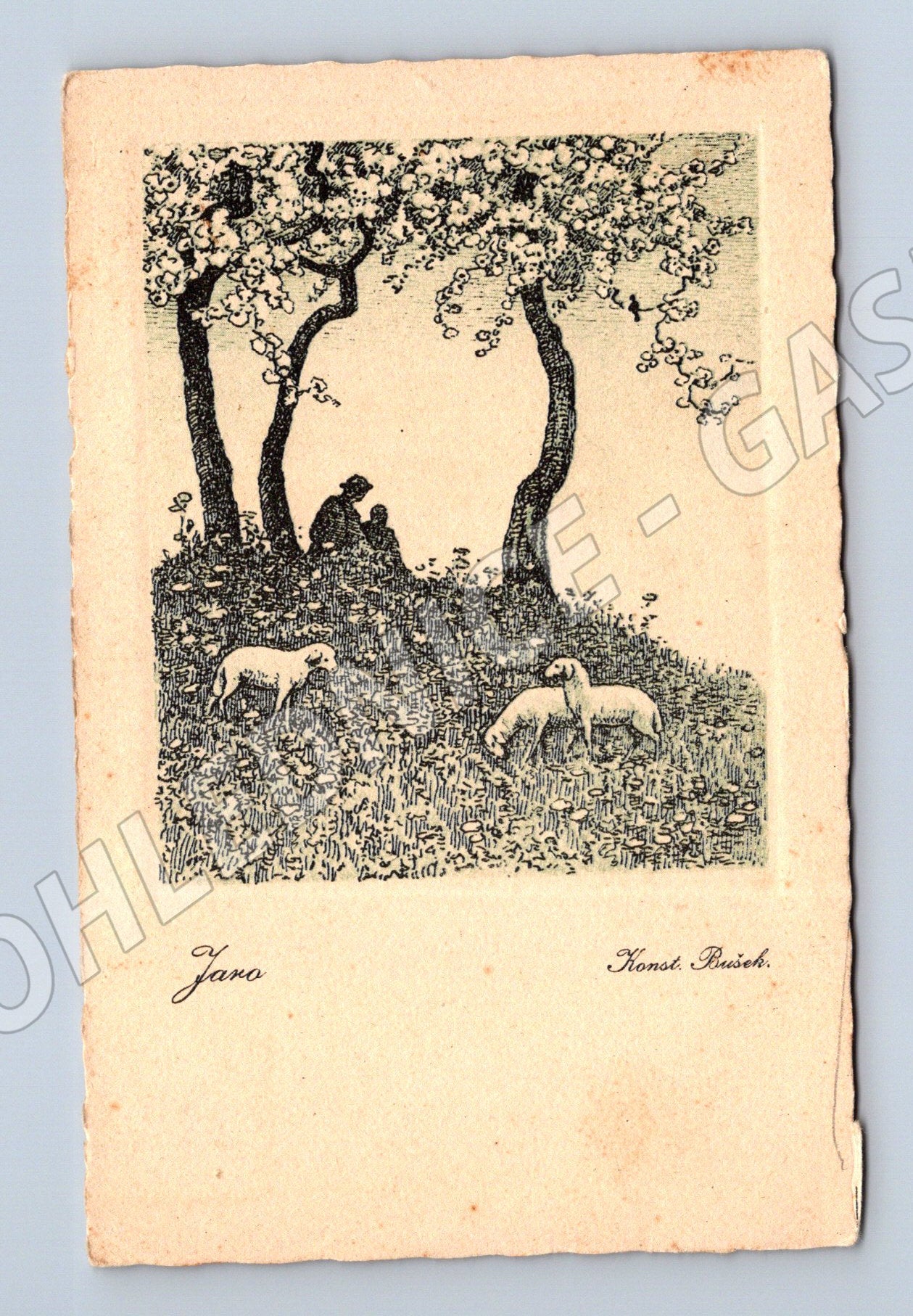 Originální stará pohlednice s uměleckým motivem dvou koní pod stromem od známého českého malíře Karel Benko. Na přední straně je kvalitní černobílá kresba ve stylu grafiky, která zachycuje dva klidně stojící koně mezi stromy a květy. Na pohlednici je uvedeno jméno autora. Okraje pohlednice jsou zachovalé, místy s drobnou patinou a stopami stáří, což podtrhuje její sběratelskou hodnotu. Zadní strana čistá, bez textu a známky, pouze lehká patina. Vhodné pro sběratele pohlednic se zvířecí tématikou, milovníky koní nebo příznivce českého výtvarného umění.