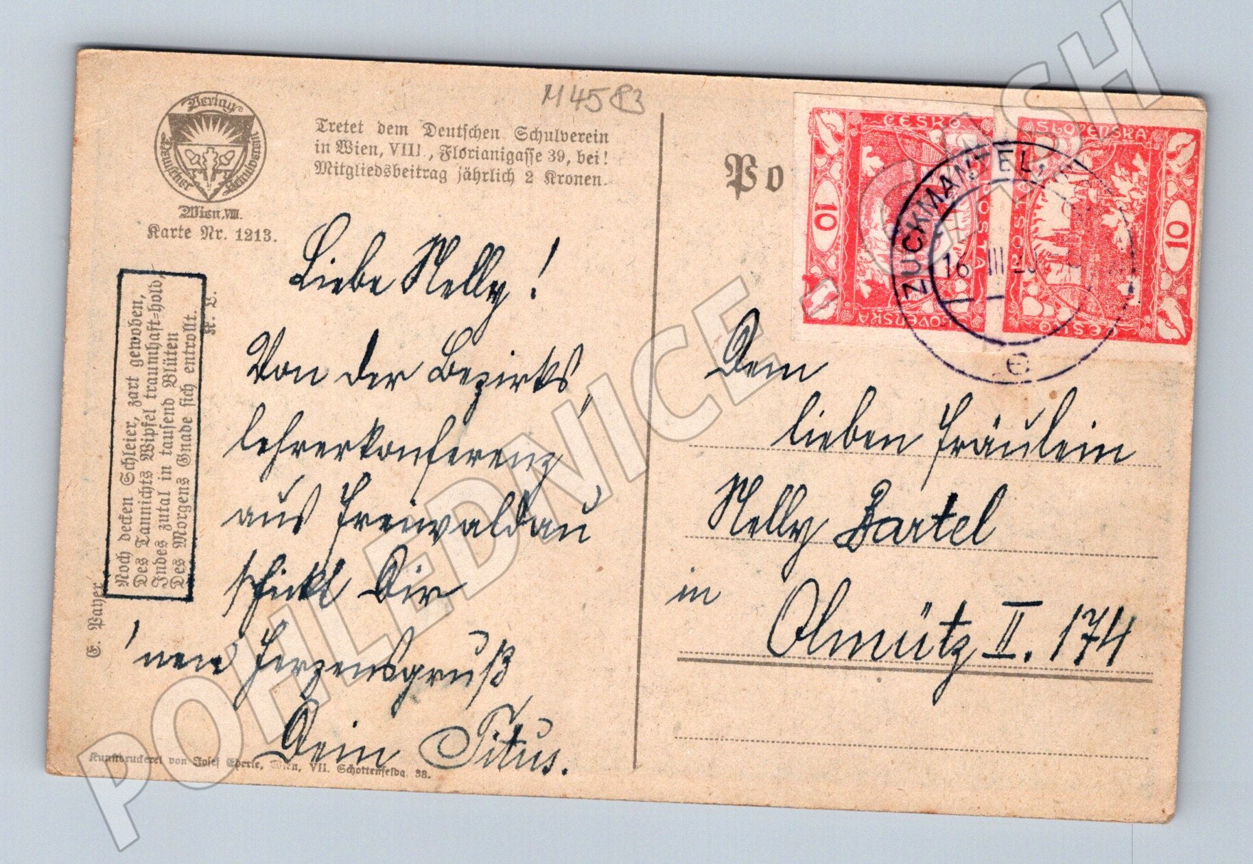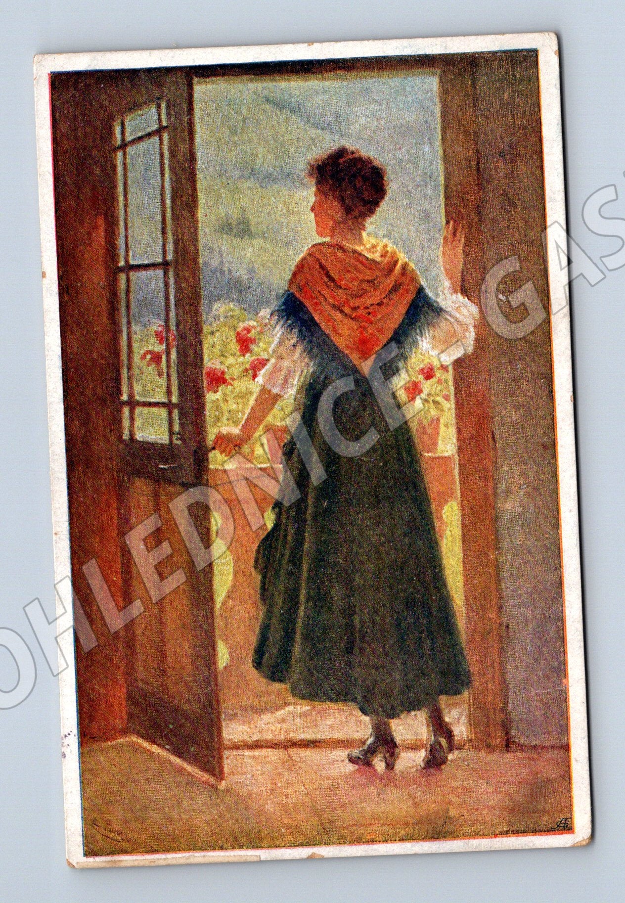 Starší barevná pohlednice s etnografickým motivem, zobrazující ženu v kroji u okna. Pohlednice je prošlá poštou a má dochované známky ČSR, razítko ZUCKMANTEL. Na zadní straně je ručně psaný vzkaz a adresa, odesláno do Olomouce. Vhodné pro sběratele historických, etnografických nebo česko-slovenských pohlednic. Stav dle fotografií, drobné opotřebení od stáří. Formát klasický, přibližně z první poloviny 20. století.
