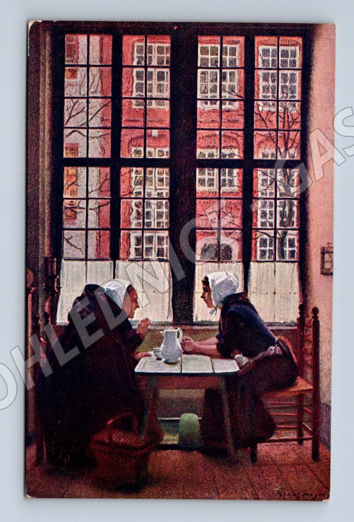 Starší pohlednice s malířským motivem podle díla od C. Claus Meyer. Pohlednice zachycuje interiér místnosti, kde dvě ženy v tradičním oděvu sedí u stolu pod velkými okny. Na zadní straně je uvedeno vícejazyčné označení Důležité zprávy a jméno autora. Pohlednice je nevypisovaná, celkově ve velmi dobrém sběratelském stavu, pouze mírné známky stáří a uložení. Vhodné pro sběratele motivů malířství a etnografie.