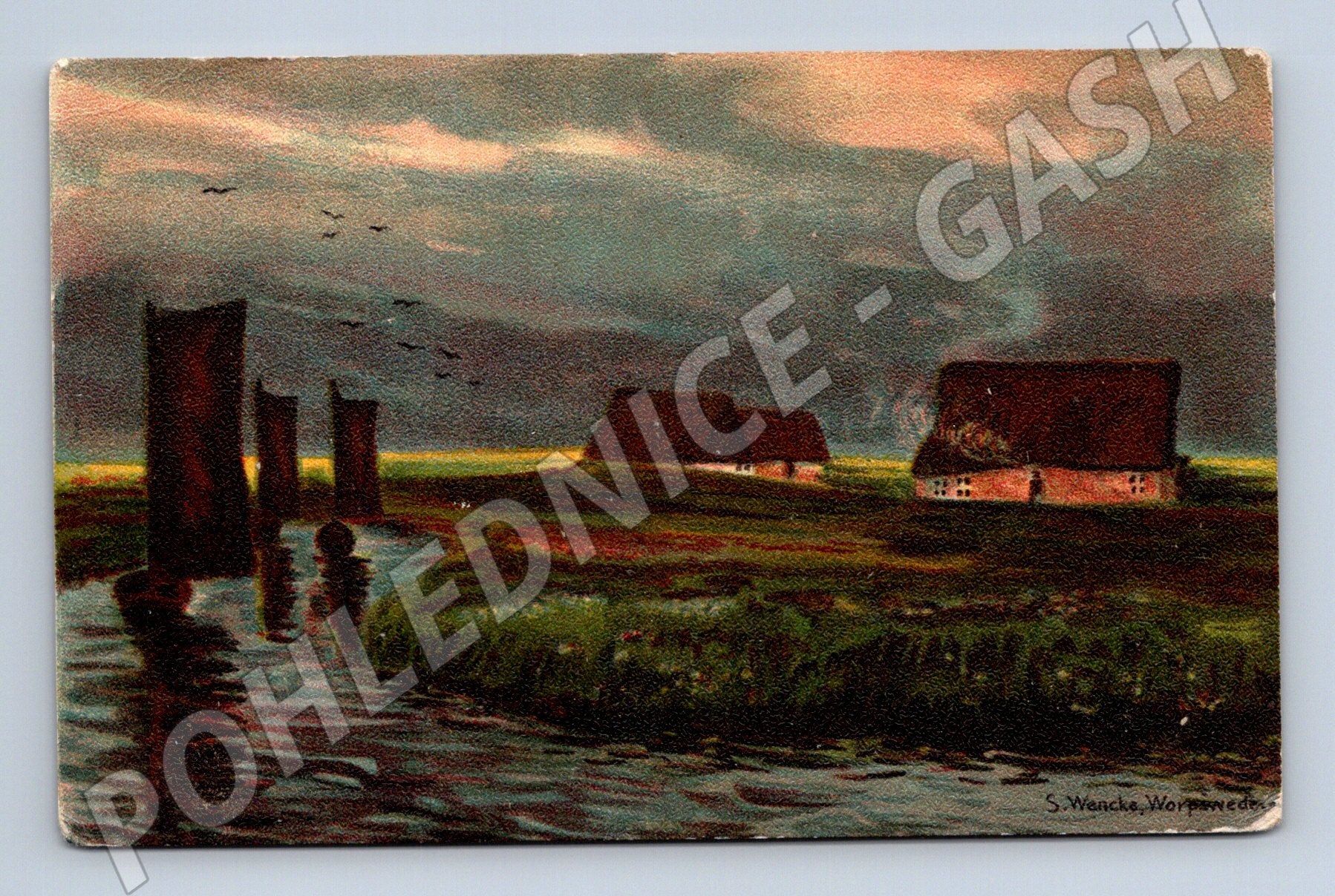 Originální stará pohlednice s malířským motivem venkovské krajiny. Scéna ukazuje několik tradičních stavení se slaměnými střechami, rozprostřených v členité krajině s vodní plochou v popředí a dramatickou oblohou při západu slunce. Kresba je dílem S. Wencke, Worpwede, jak je uvedeno v pravém dolním rohu. Zadní strana je neprošlá, s drobným zašpiněním a opotřebením v rozích odpovídajícím stáří. Pohlednice má rozměry typické pro začátek 20. století.