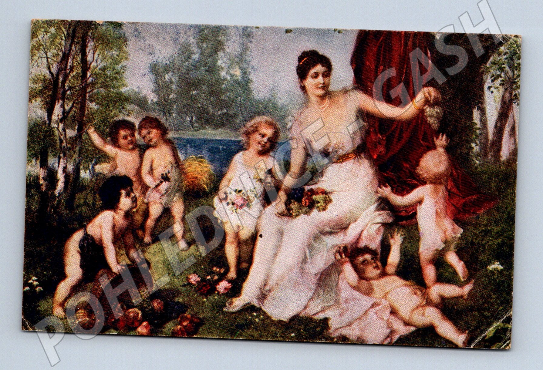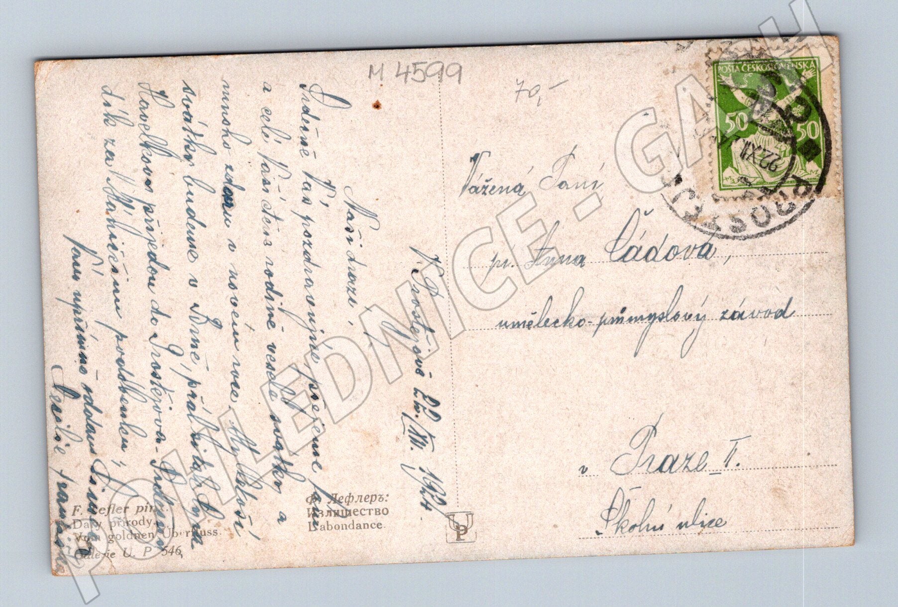 Nabízím starou pohlednici s uměleckým motivem, která zachycuje ženu sedící v přírodě obklopenou skupinou dětí nebo andílků s květinami a ovocem. Pohlednice má malířský, alegorický styl a spodním rohu je označení F. Seiler pinx. a název Das goldene Überfluss - Von goldenem Überfluss - L’Abondance . Na zadní straně je ručně psaný text, poštovní razítko a známka z období Československa. Vhodné pro sběratele starých pohlednic, milovníky historie a výtvarného umění. Stav viz foto, mírně opotřebované rohy odpovídající stáří.