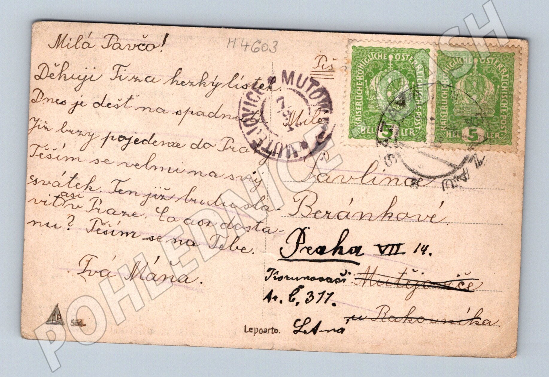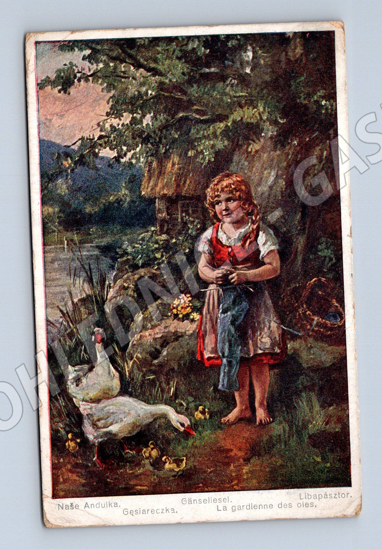 Originální stará pohlednice s motivem dívky a husy u lesa. Na přední straně je malebná scéna s dívkou sedící na pařezu, kolem níž stojí husa s housaty. Pohlednice nese vícejazyčný popis (česky, německy, francouzsky, maďarsky) a název Naše Andulka, Gänslerczka, Gänselieserl, La gardienne des oies, Libapásztor . Zadní strana je popsána, zaslána do Prahy, s rakouskými známkami a ručním psaním z roku 1914. Pro sběratele pohlednic, zájemce o motivy zvířat, dětí nebo venkovského života. Celkově zachovalý stav s drobnými známkami opotřebení odpovídající stáří.