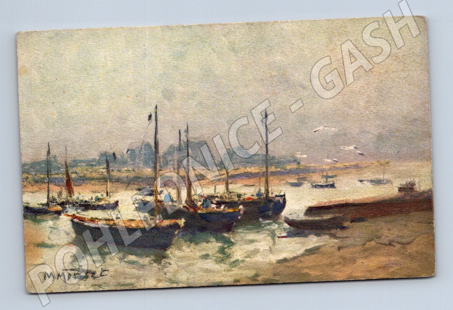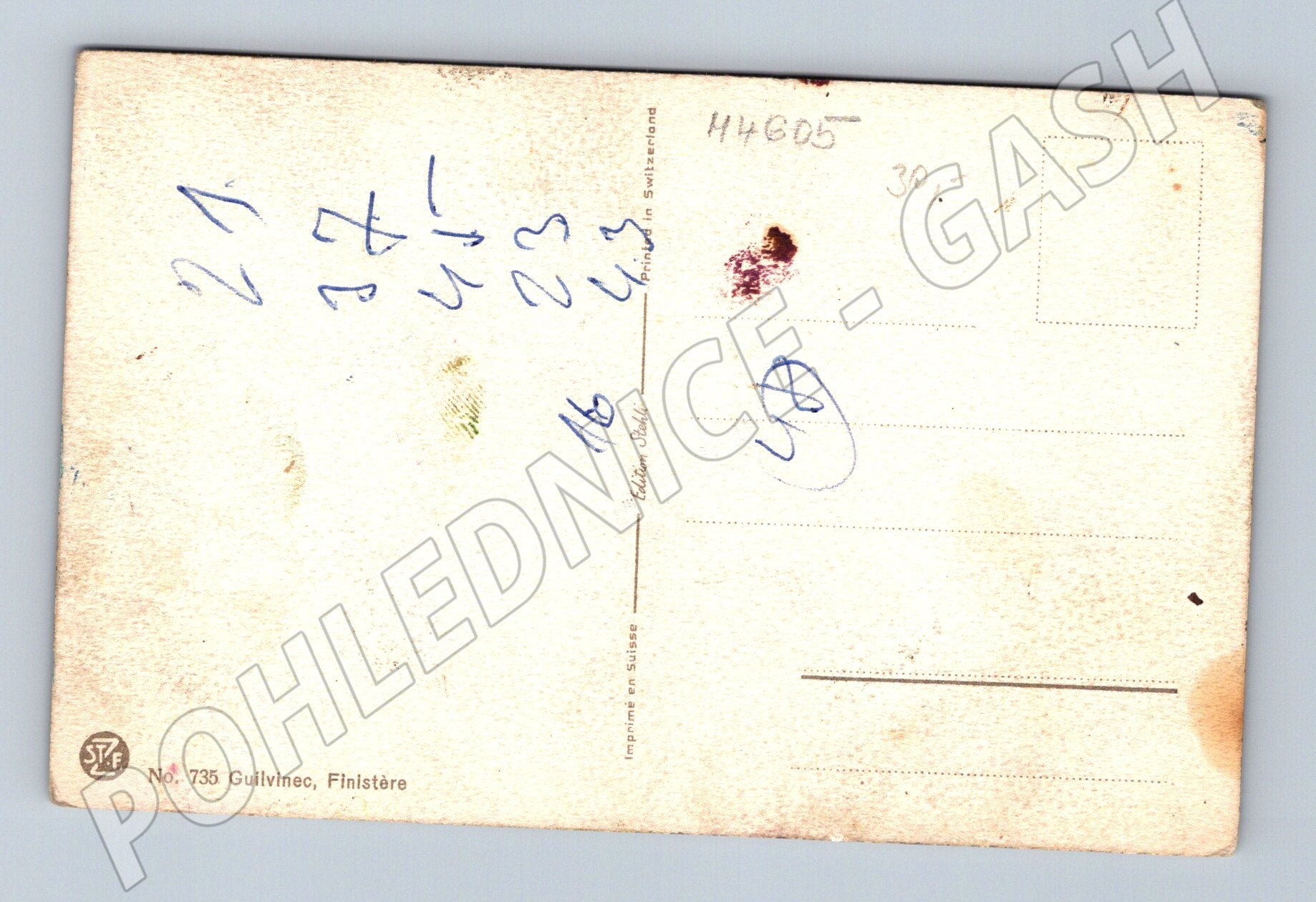 Nabízím starou pohlednici s motivem malovaného přístavu Guilvinec ve francouzském regionu Finistere. Pohlednice zachycuje malebnou scénu s rybářskými loděmi na klidné vodní hladině a pobřežím v pozadí. Autor obrázku je M. M. Piece, na zadní straně je uvedeno číslo série 735 a označení místa Guilvinec, Finistere. Pohlednice nese známky stáří a byla popsána, viz foto. Velmi pěkný sběratelský kus vhodný do sbírky vodní dopravy nebo pohlednic s motivy přístavišť a plavidel.