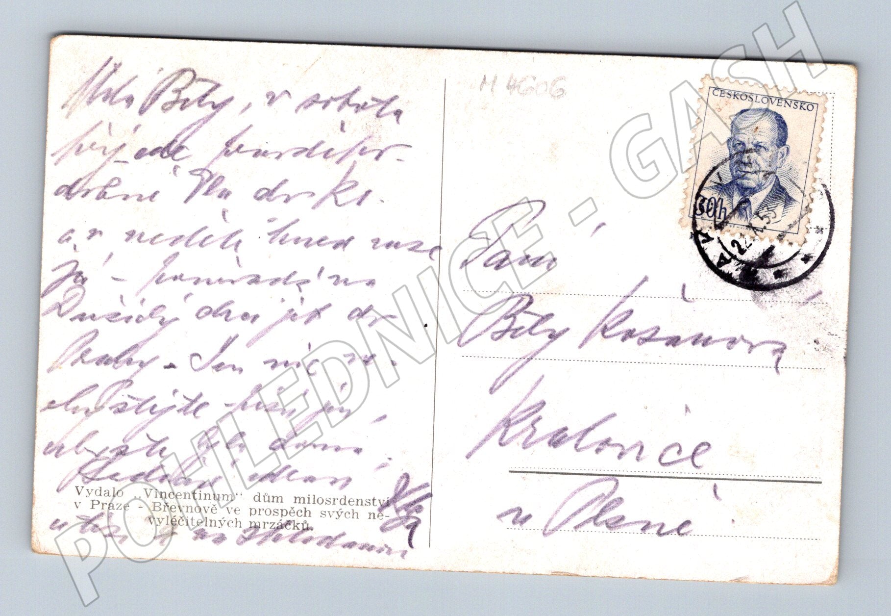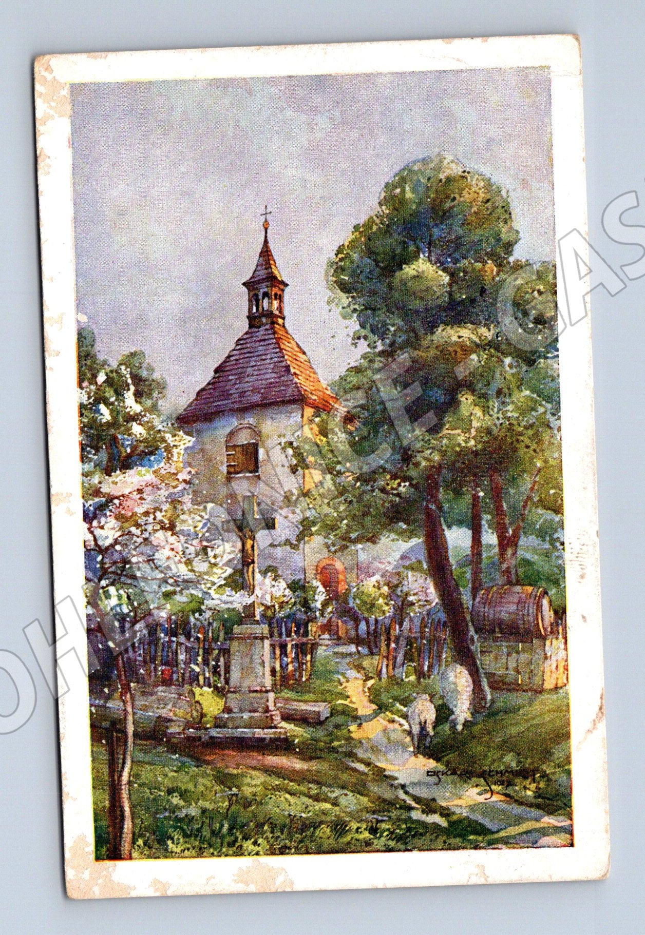 Stará pohlednice České republiky menšího formátu, datovaná před rokem 1950. Na přední straně je barevná kresba zachycující vesnický kostelík s věží, obklopený stromy a plotem, v popředí probíhá jarní slavnost či trh. Krásné detailní provedení typické pro české pohlednice z první poloviny 20. století. Na zadní straně je ručně psaný text, adresa a dobová známka Československo. Vydal Vincentinum dům milosrdenství v Praze-Břevnově ve prospěch svých nevyléčitelných mrzáků. Pohlednice nese známky stáří – mírné opotřebení a lehké skvrny na okrajích. Ideální k doplnění sbírky historických českých pohlednic nebo jako zajímavý sběratelský artefakt s charitou významem.