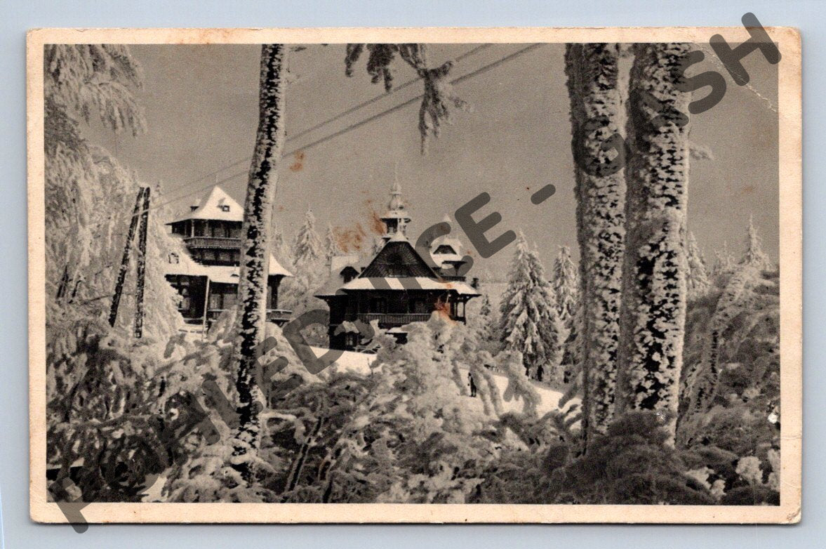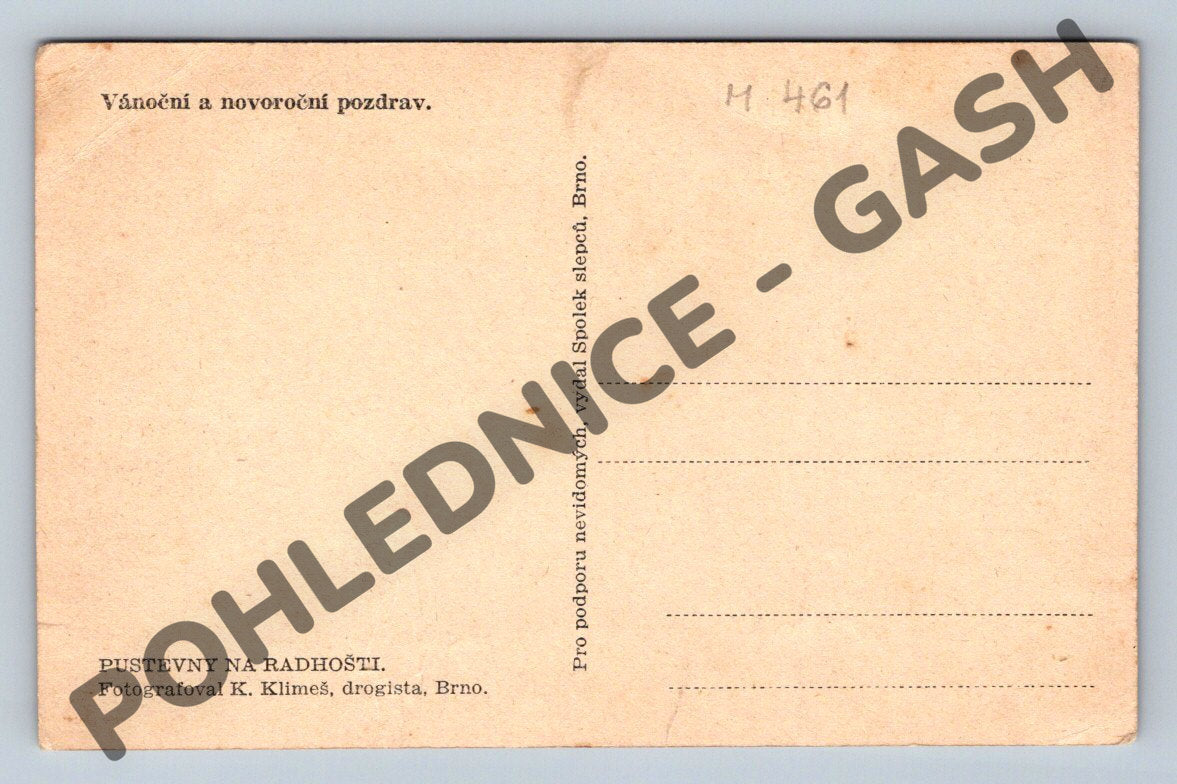 Starší pohlednice zobrazující Pustevny na Radhošti v zimním období. Na snímku jsou vidět tradiční horské chaty pokryté sněhem a okolní zasněžený les. Pohlednice byla fotografována K. Klimešem, drozistou z Brna. V zadní části pohlednice je vytištěný text Vánoční a novoroční pozdrav a popis fotografie. Pohlednice je vhodná pro sběratele zimních motivů, horské architektury a českých krajinných pohlednic.