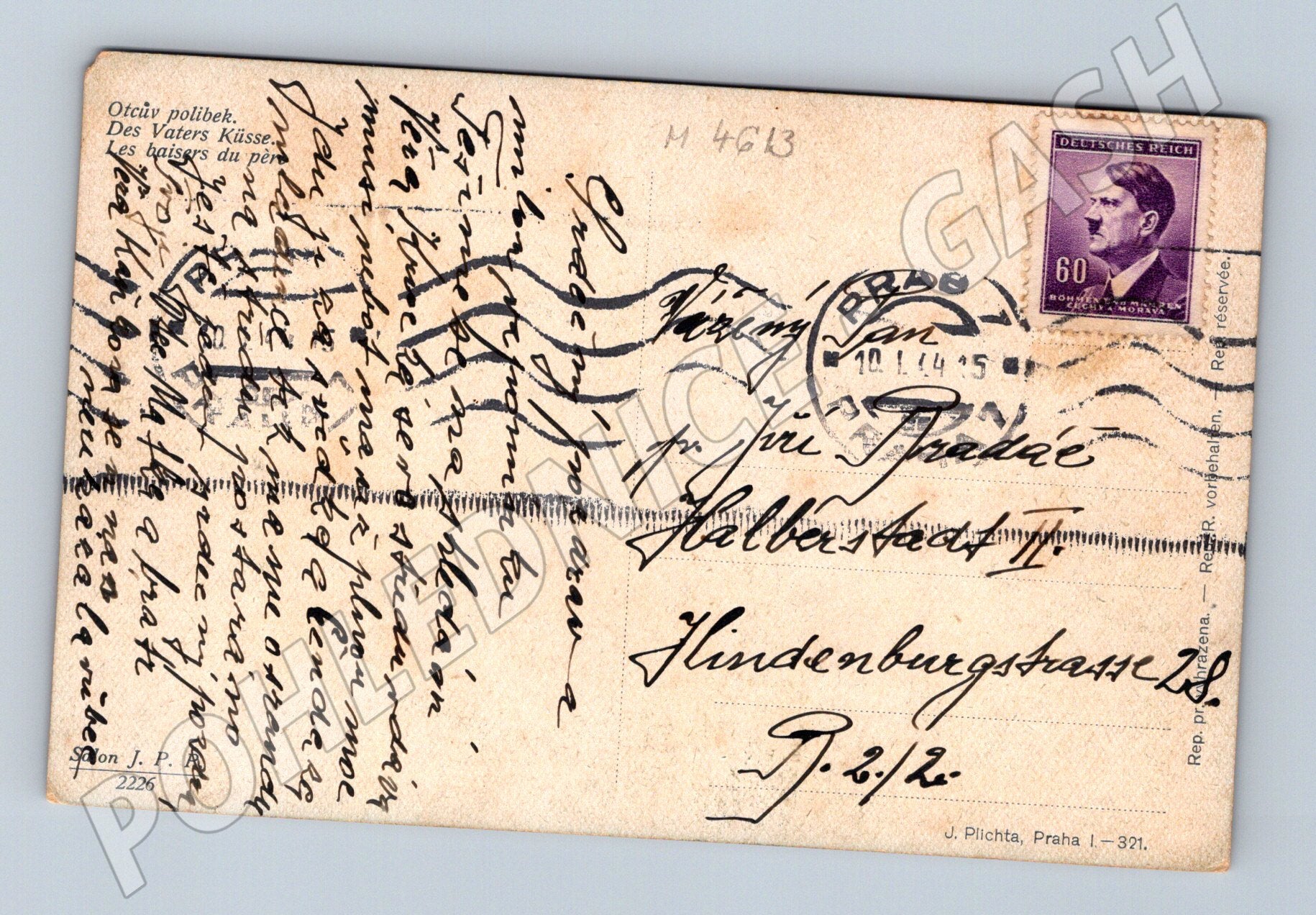 Starobylá pohlednice zobrazující etnografickou scénu – pravděpodobně jde o výjev ze života na vesnici nebo rodinné prostředí v tradičních krojích. Pohlednice je poštovně prošlá, s razítkem z období německé okupace (1944) a známkou Deutsches Reich (60h s portrétem). Na zadní straně je ručně psaný text. Vydavatel: J. Plichta, Praha I – 321. Velmi zajímavý a sběratelsky cenný kus, zejména vzhledem k době a tematice. Stav odpovídá stáří, mírné opotřebení hran a rohů. Ideální pro sběratele etnografických nebo válečných pohlednic.