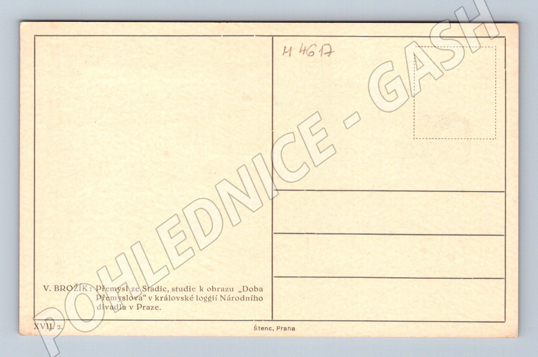 Originální pohlednice se studijní kresbou od známého českého malíře V. Brožíka, nazvaná Přemysl ze Stadic, studie k obrazu Doba Přemyslova . Na přední straně je detailně zpracovaná kresba dvou postav v historickém oděvu. Pohlednice vznikla jako reprodukce studie k obrazu v královské lóži Národního divadla v Praze. Na zadní straně jsou informace o autorovi a díle. Pohlednice je nepopsaná a ve velmi dobrém stavu. Vhodná pro sběratele historických a uměleckých pohlednic či zájemce o české dějiny a výtvarné umění.