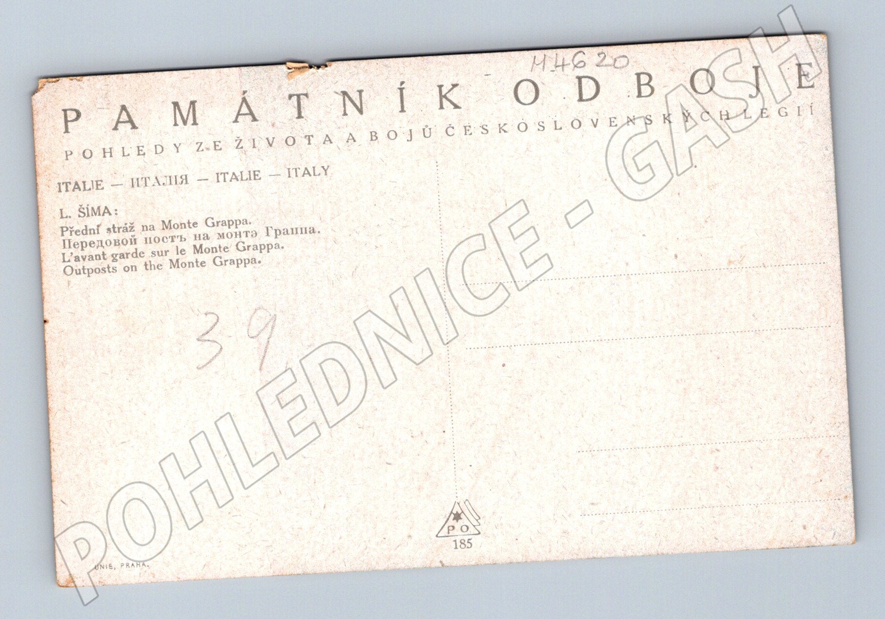 Pohlednice ze série Památník odboje - Pohledy ze života a bojů Československých legií s názvem Přední stráž na Monte Grappa . Autorem malby je L. Šíma. Na pohlednici je barevně vyobrazen horský terén a vojenské postavení na italském Monte Grappa, které bylo dějištěm bojů Československých legií během první světové války. Na zadní straně jsou popisy v několika jazycích (čeština, ruština, francouzština, angličtina). Vydal Unie, Praha, APO 185. Pohlednice je ve sběratelském stavu, s jemnými známkami stáří a drobným opotřebením na hranách. Ideální přírůstek do sbírky legionářských a historických pohlednic.