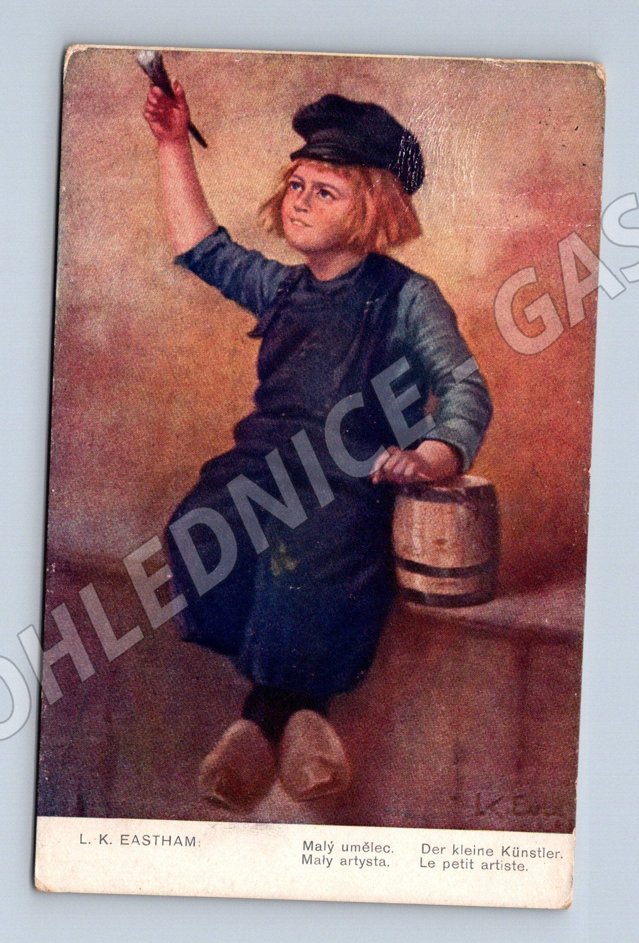 Originální barevná pohlednice s názvem Malý umělec od L. K. Eastham. Na lícové straně pohlednice je vyobrazen chlapec v malířském pracovním oděvu s baretem, štětcem a kbelíkem, v jemně humorném duchu. Pohlednice je popsaná v několika jazycích (česky, německy a francouzsky). Zadní strana je ručně popsána, s datem 26. ledna 1923 a poštovním razítkem. Pohlednice nese známky stáří, v jednom rohu zažloutlá stopa po odstranění známky nebo lepidla. Přes svůj věk je obrazová strana velmi zachovalá, pestré barvy a pouze drobné opotřebení hran. Krásný sběratelský kousek s historickou hodnotou.