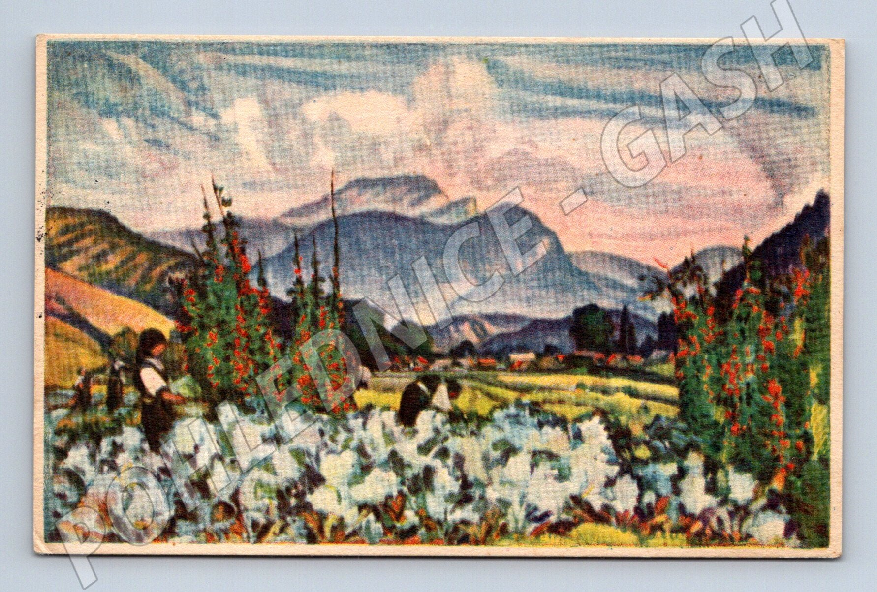 Originální pohlednice s etnografickým motivem – studie od Martina Benky z roku 1929. Na přední straně je krásně ilustrovaná venkovská krajina s postavami pracujícími na poli, na pozadí slovenské hory. Barvitý malířský styl zobrazuje lidové tradice, práci na venkově a jedinečnou atmosféru slovenského venkova první poloviny 20. století. Zadní strana obsahuje rukopis v češtině se známkou a datací 27. 5. 1929. Vhodné pro sběratele etnografických a historických pohlednic či milovníky díla Martina Benky. Zachovalý stav, znatelné stáří i patina.