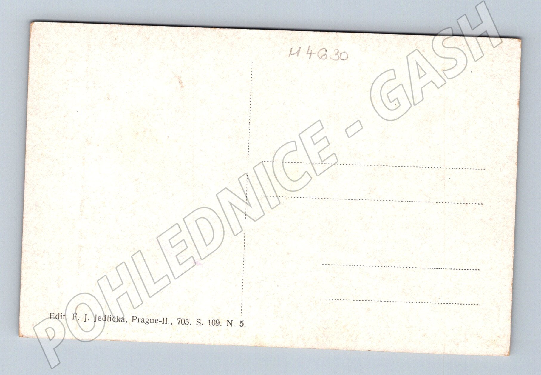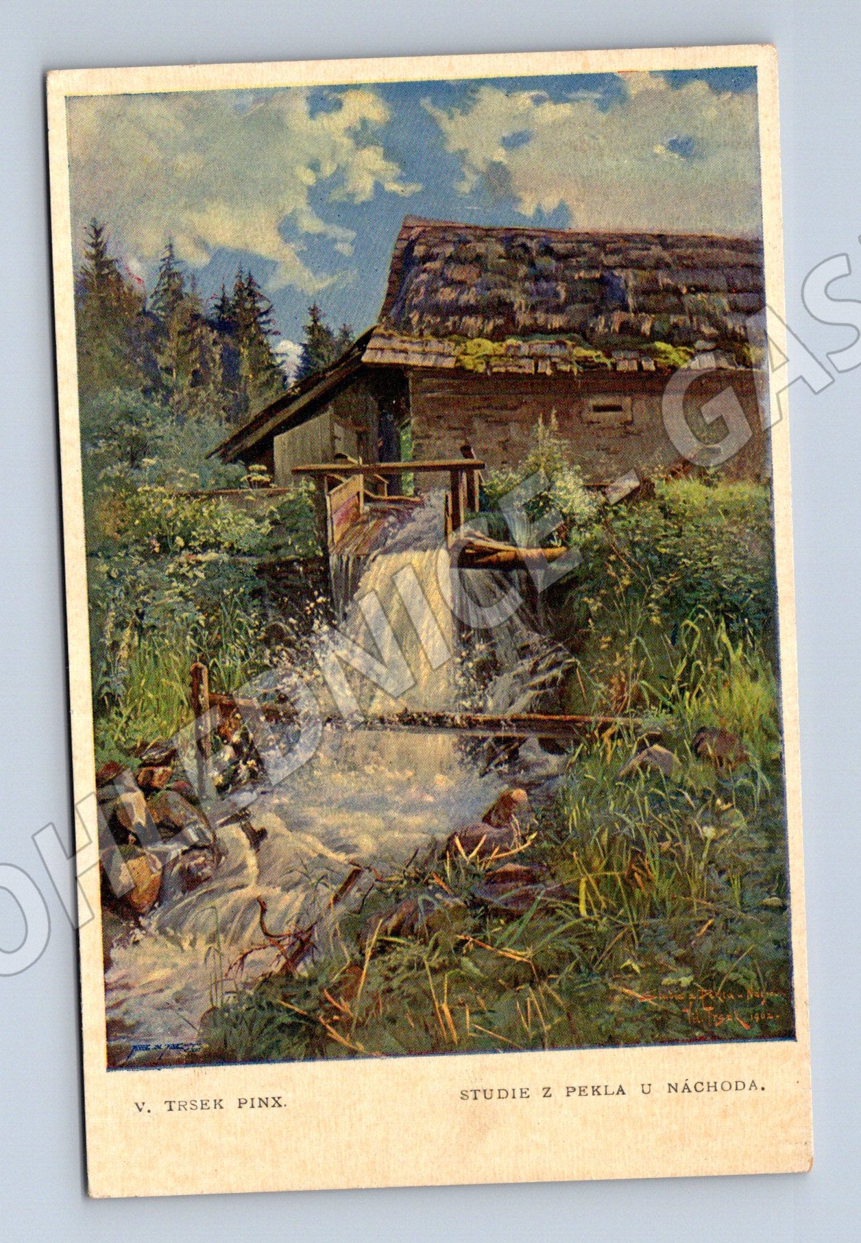 Originální stará pohlednice ve formátu odpovídajícím malému formátu do roku 1950. Na pohlednici je malovaný motiv s názvem Studie z Pekla u Náchoda od malíře V. Trska. Zobrazuje malebnou scenérii mlýna na okraji lesa s tekoucí vodou a skalním masivem v pozadí. Vydal F. J. Jedlička, Praha II. Na zadní straně bez psaní či známky, pouze katalogové číslo. Pohlednice je ve velmi pěkném, sběratelském stavu.