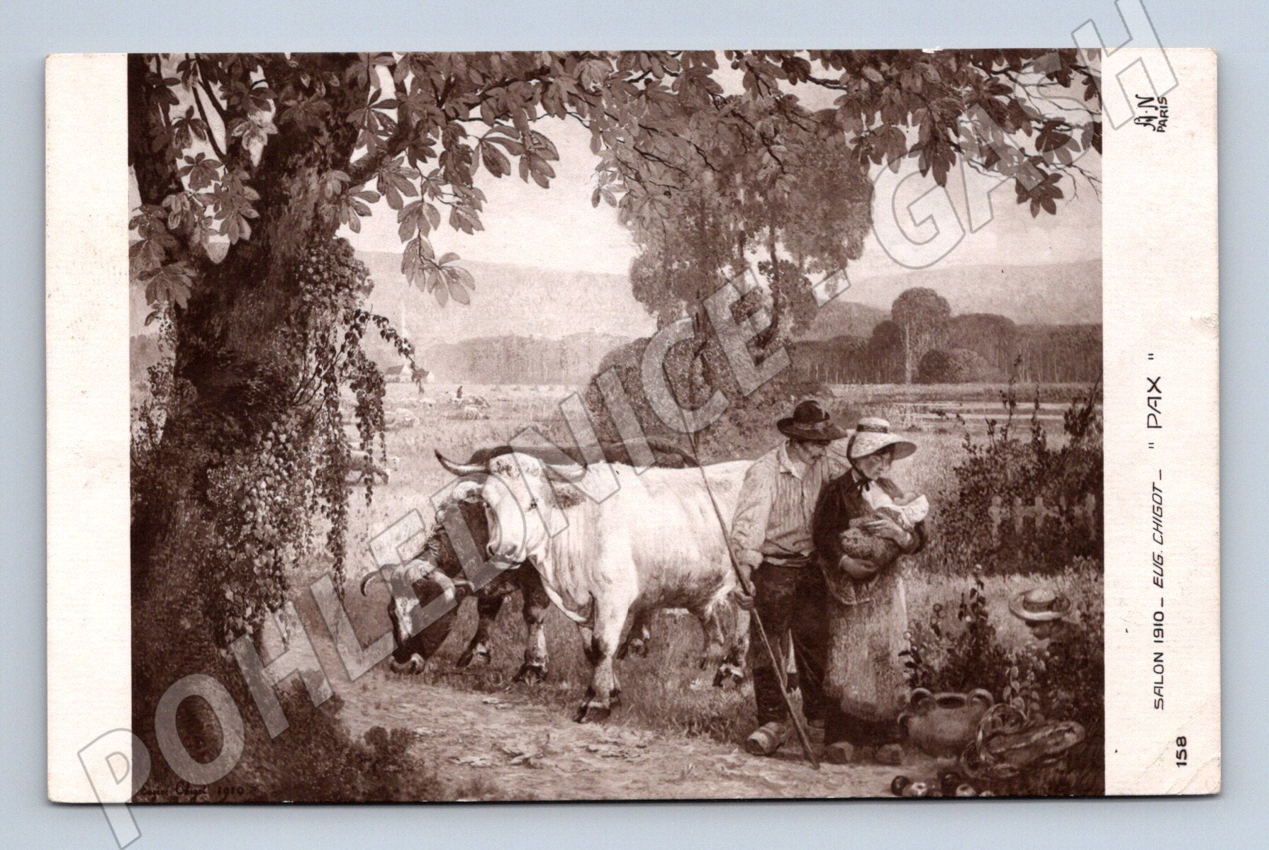Starobylá pohlednice s uměleckým motivem od malíře Eug. Chigot, Salon 1910, s názvem PAX . Pohlednice zobrazuje klidnou venkovskou scénu – muž, žena a dítě stojí u bílé krávy pod stromem, v pozadí rozlehlá krajina. Krásné detaily a jemná kresba, atmosféra venkova začátku 20. století. Pohlednice je použita, s poštovní známkou, razítkem a ručně psaným textem z roku 1910. Stav viz foto – sběratelský kousek vhodný do kolekce historických pohlednic s malířskými motivy.